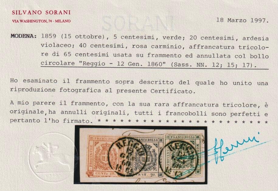 | Zusatzinformationen und Suchstichworte: | 181. Laser Invest Auktion - Live Auktion 15. - 16. April 2023 Los 323 Italien Staaten Modena GOVERNO PROVVISORIO. Frammento di lettera affrancato con combinazione tricolore per complessivi centesimi 65 con l'alto valore da 40 centesimi, annullati in data 12/1/1860. Dettagliati certificati Zanini e Sorani Ausruf 650,00 EUR |