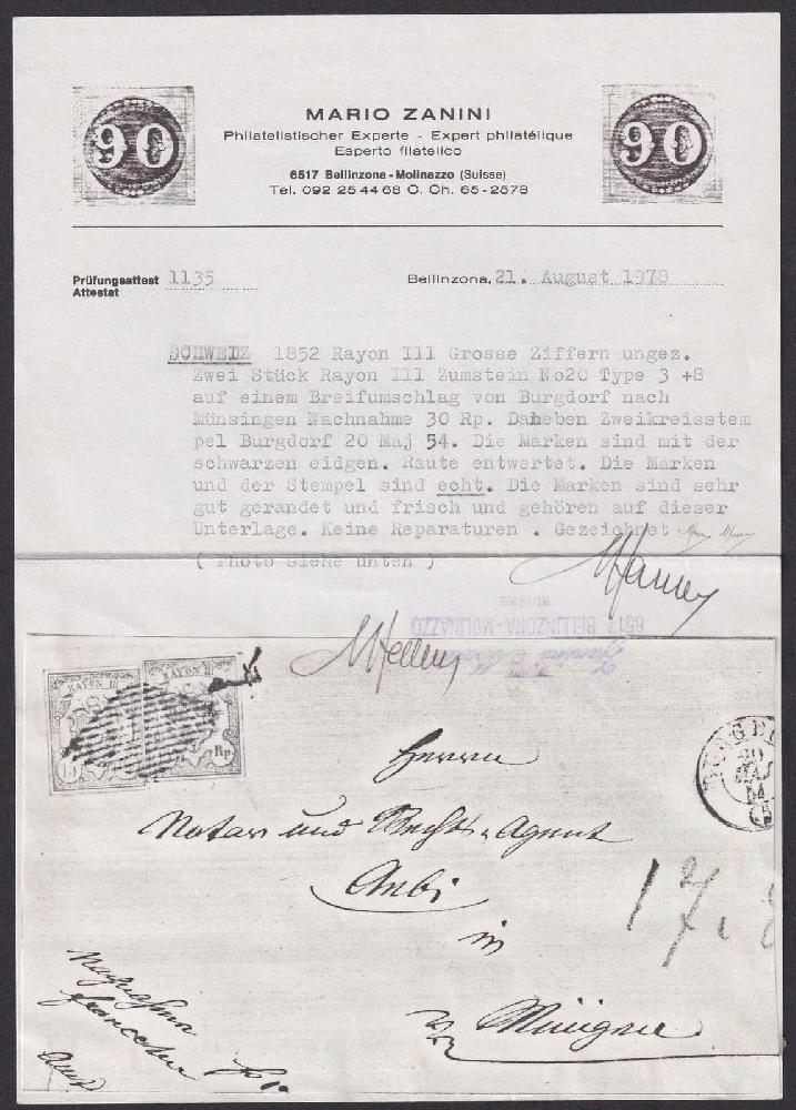 | Zusatzinformationen und Suchstichworte: | Luzernerraute Webshop Los 0000105380 Rayon III (grosse Ziffer) BURGDORF 1854 nach Münsingen, Type 3 & 8 beide breitrandig geschnitten, auf sauberem Umschlag, neben rechter Marke Brief leicht beschädigt, verkürzt zusammengefalten, Attest ZANINI (1978) SBK: 800.-+ Festpreis 250,00 CHF |