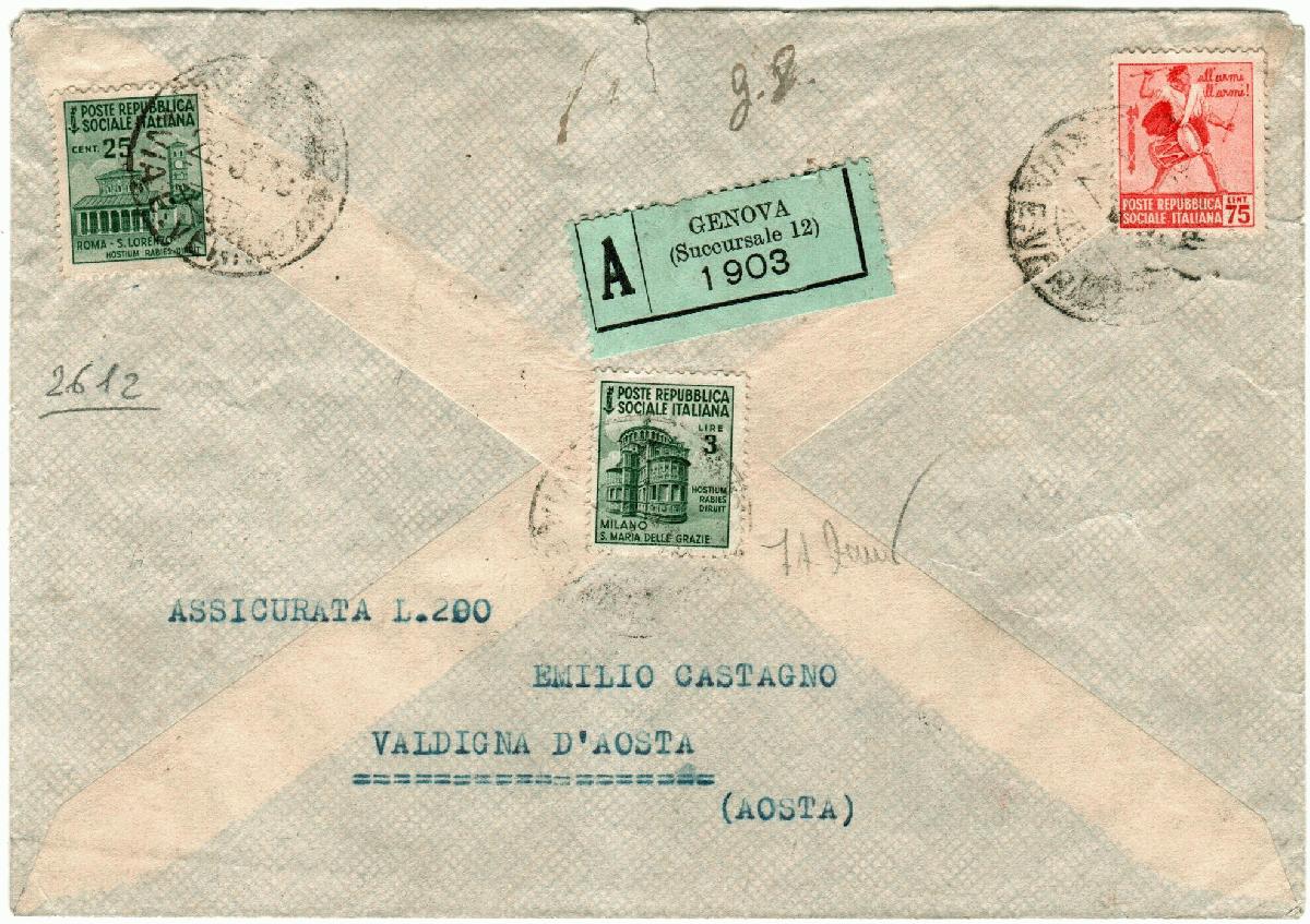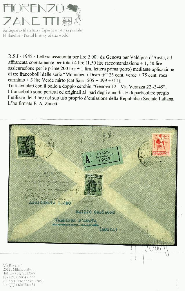 | Zusatzinformationen und Suchstichworte: | Filatelia Sammarinese Saalauktion 28. - 29. April 2023 Los 1600 Italien Republik Soziale Italiano Assicurata 200 lire da Genova 22.3.45 a Valdigna con al retro Mon. distrutti 25 + 75 c. + 3 l. (499 + 505 + 511). Raro uso del 3 lire in R.S.I.- Cert. F. Zanetti Ausruf 300,00 EUR |