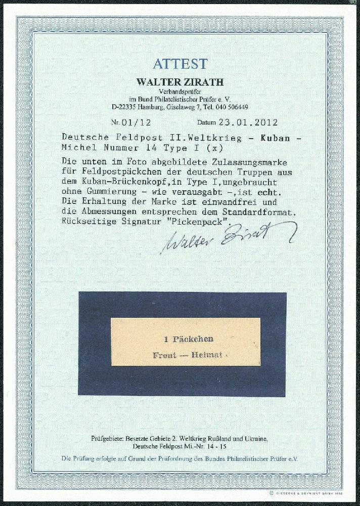 | Zusatzinformationen und Suchstichworte: | Gert Müller 117. Auktion 23. Februar 2023 Los 4005 Deutsche Besetzung II. WK, Feldpostmarken DIE SELTENE KUBAN-PÄCKCHENMARKE: 1 Päckchen Front-Heimat, die sehr seltene Kuban-Päckchenmarke, wundervoll farbfrisch und tadellos postfr., wie verausgabt auf ungummiertem Papier. Ein Luxusstück dieser großen Feldpost-Seltenheit, die in fast allen Sammlungen fehlt! Fotoattest "DIE ERHALTUNG DER MARKE IST EINWANDFREI" Zirath BPP Ausruf 4.000,00 EUR |