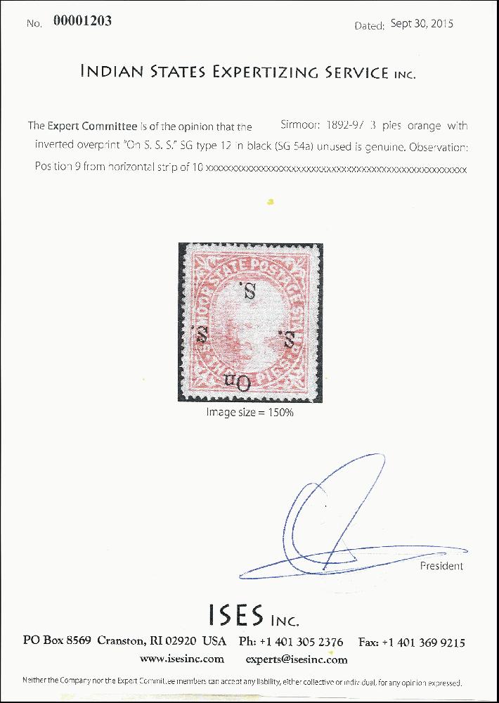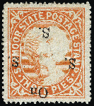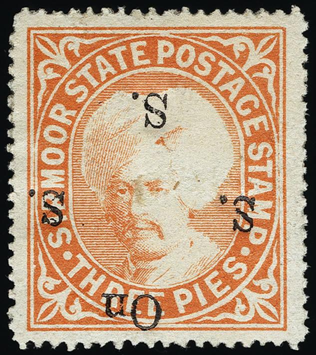| Zusatzinformationen und Suchstichworte: | Heinrich Köhler 380. Auktion 16. - 25. März 2023 Los 1635 1892-97 3p orange overprinted "On S S S" with error overprint inverted. ISES certificate (SG value £900) Ausruf 300,00 EUR |