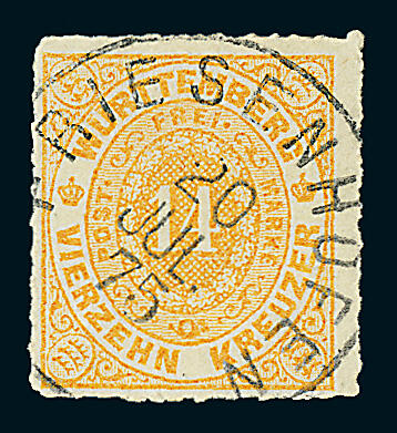| Zusatzinformationen und Suchstichworte: | Dr. Derichs 169. Auktion - TROST VI - Königreich Württemberg 29. April 2023 Los 2049 Altdeutschland Württemberg "Friesenhofen 20 Jul.75", K1 ideal zentrisch auf Luxusstück 14 Kreuzer orangegelb. Die Postexpedition in Friesenhofen wurde erst am 1. November 1875 eröffnet, weshalb Abschläge auf Kreuzer-Marken von großer Seltenheit sind. Im vorliegenden Fall wurde die 14-Kreuzer-Marke zudem zulässigerweise als 40-Pfennig-Marke aufgebraucht. Neues Fotoattest Heinrich BPP: "Echt und einwandfrei.". (Handbuch = 600 Punkte) Zuschlag 500,00 EUR |
