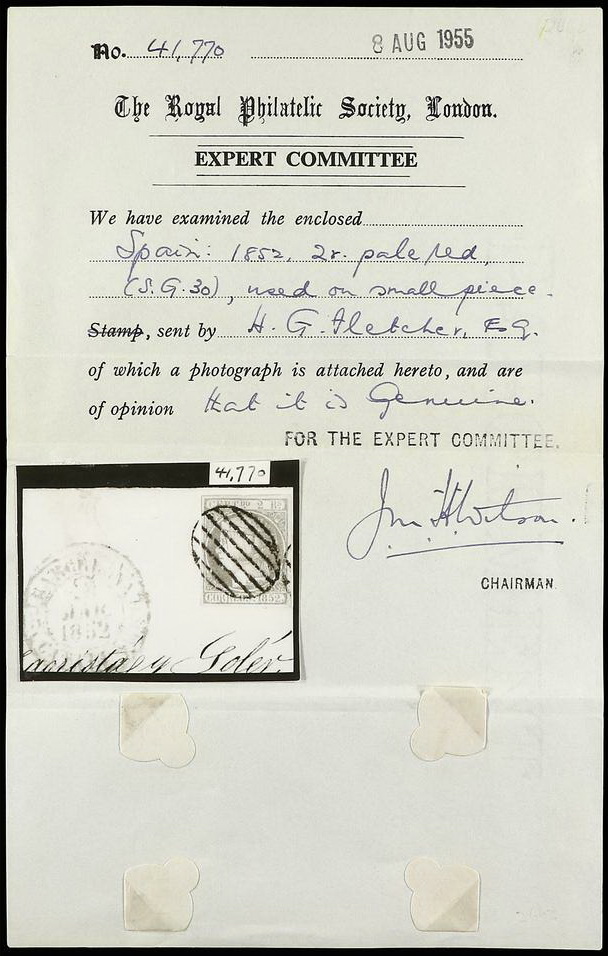 | Zusatzinformationen und Suchstichworte: | Soler y Llach - 786. Auktion - Spanien, Kolonien und der Rest der Welt 3. - 4. April 2023 Los 32 Spanien ESPAÑA. FALSO SPERATI. 2 reales naranja sobre fragmento original con mat. parrilla y fechador de Barcelona sello falso Sperati despegado del fragmento para su examen y vuelto a colocar con un fijasellos tal y como se hacía antiguamente, marquillado por J. BRUN y con certificado de LA ROYAL PHILATELIC SOCIETY como auténtico de 1955. PIEZA EXCEPCIONAL y de gran interés. Ed.14 Zuschlag 320,00 EUR |