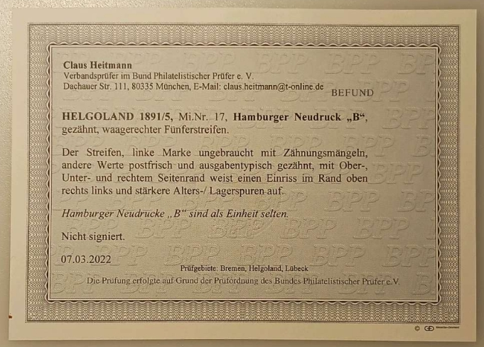 | Zusatzinformationen und Suchstichworte: | Helgoland 1891/5, Mi.Nr. 17, Hamburger Neudruck "B", gezähnt, waagrechter Fünferstreifen. Der Streifen, linke Marke ungebraucht mit Zähnungsmängeln, andere Werte postfrisch und ausgabentypisch gezähnt, mit Ober-, Unter- und rechtem Seitenrand weist einen Einriss im Rand oben rechts links und stärkere Alters-/Lagerspuren auf. Hamburger Neudrucke "B" sind als Einheit selten. Siehe auch https://www.philaseiten.de/cgi-bin/index.pl?ST=1066 (ab Beitrag 144) |