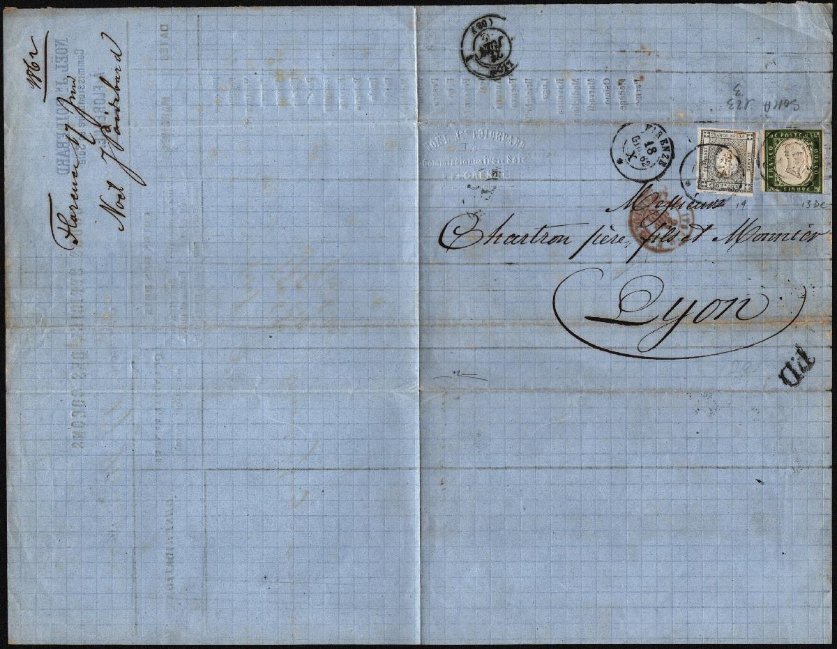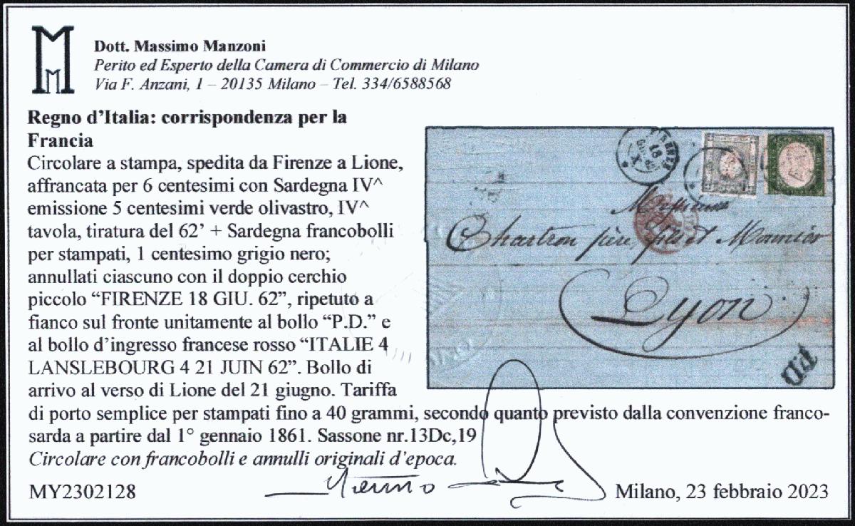 | Zusatzinformationen und Suchstichworte: | Versuch einer Übersetzung: Königreich Italien: Korrespondenz für Frankreich Drucksache von Florenz nach Lyon, frankiert mit 6 Centesimi aus Sardinien 4. Ausgabe 5 Centesimi olivgrün, 4. Tafel, Auflage 1862 + Sardinien-Briefmarke für Drucksachen, 1 Centesimo grauschwarz; jeweils gestempelt mit dem doppelten Kleinkreis "FIRENZE 18 GIU. 62", auf der Vorderseite nebenseitig wiederholt nebst Stempel "P.D." und dem roten französischen Grenzstempel "ITALIE 4 LANSLEBOURG 4 21 JUIN 62". Ankunftsstempel Lyon vom 21. Juni auf der Rückseite. Tarif für Einfachfrankatur für Drucksachen bis 40 Gramm gemäß den Bestimmungen des französisch-sardischen Abkommens ab 1. Januar 1861. Sassone Nr. 13Dc,19 Drucksache mit originalen Marken und Stempeln aus der Zeit. |