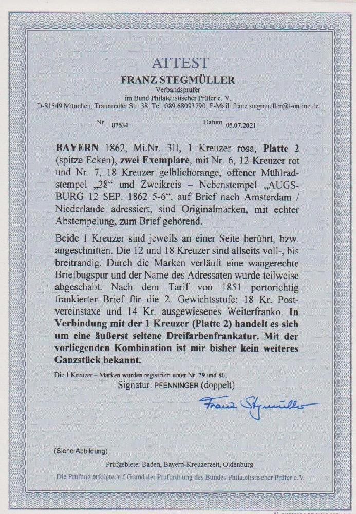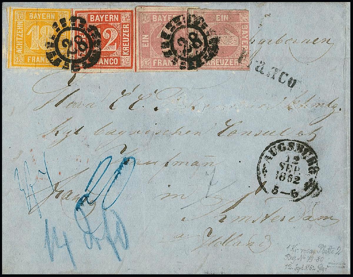 | Zusatzinformationen und Suchstichworte: | Rauhut & Kruschel - 217. Auktion 21. - 22. April 2023 Los 19 Altdeutschland Bayern 1 Kr. rosa, gute Platte II mit spitzen Ecken, per zwei, nebst 12 Kr. rot und 18 Kr. orange auf Auslandsbrief mit oMR "28" und K2 "Augsburg" 1862 nach Amsterdam/Holland. Die beiden 1 Kr. je an einer Seite berührt bzw. angeschnitten, die 12 und 18 Kr. vollrandig, leichte Bugspur durch die Frankatur und Adreßname radiert. Portogerechte 32-Kr.-Frankatur für die 2. Gewichtsstufe (18 Kr. Postverein plus 14 Kr. Weiterfranko). In vorliegender Kombination mit gleich zwei Exemplaren der Nr. 3II Unikat. Sign. Pfenninger (Register-Nr. 79/80) und Attest Stegmüller Ausruf 8.000,00 EUR |