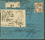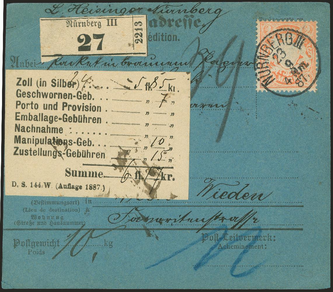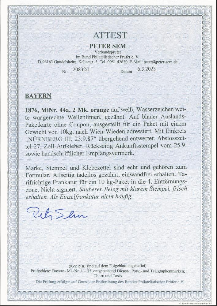 | Zusatzinformationen und Suchstichworte: | 381. Auktion Heinrich Köhler 27. Mai 2023 IBRA Sonderauktion Los 2 1876, Wappenausgabe 2 Mark orange als portogerechte vorderseitig geklebte Einzelfrankatur auf blauer Paketkarte von "NÜRNBERG III 23 8 87" nach Wien mit Eingangsstempel, sehr schöne und einwandfreie Erhaltung. Sign. Dr. Helbig BPP und Fotoattest Sem BPP (2023 Ausruf 200,00 EUR Zuschlag 300,00 EUR (aus der Sammlung Erivan Haub) |