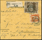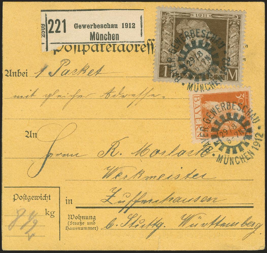 | Zusatzinformationen und Suchstichworte: | 381. Auktion Heinrich Köhler 27. Mai 2023 IBRA Sonderauktion Los 6 1911, Luitpold 1 Mark in Type II und 30 Pfennig in Type I, mit jeweils sauber aufgesetztem Sonderstempel "BAYER GEWERBESCHAU MÜNCHEN 1912 29/8" auf Paketkarte mit Sonder-Paketzettel "Gewerbeschau 1912 München" nach Zuffenhausen mit Ankunftsstempel. Schöne und einwandfreie Erhaltung. Ein sehr seltenes Stück; bei Attesterstellung von Herrn Dr. Helbig BPP im Jahre 2000 war kein weiteres registriert. Ausruf 200,00 EUR Zuschlag 360,00 EUR (aus der Sammlung Erivan Haub) |