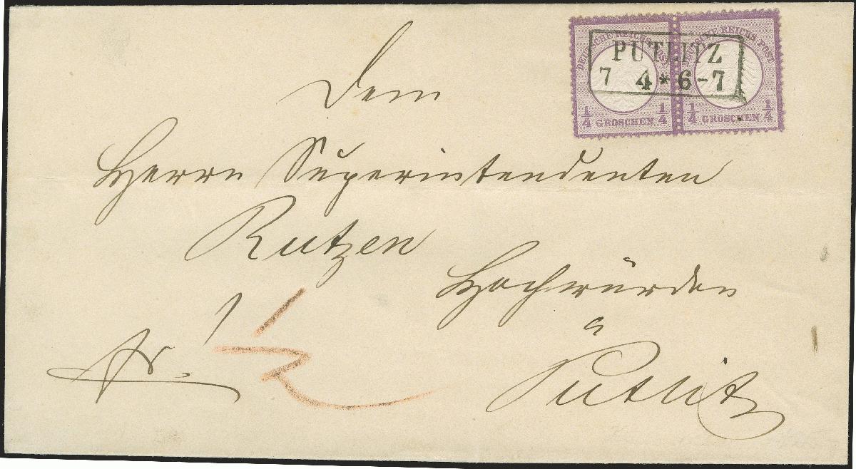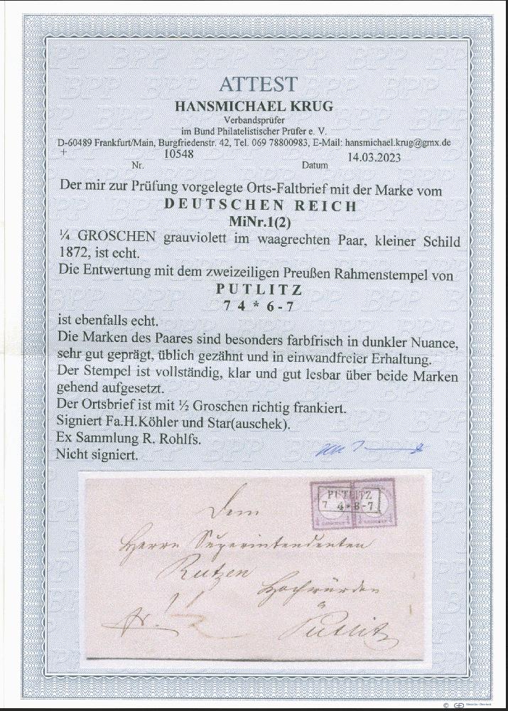 | Zusatzinformationen und Suchstichworte: | 381. Auktion Heinrich Köhler 27. Mai 2023 IBRA Sonderauktion Los 12 ¼ Groschen grauviolett im waagerechten Paar, schöne Tiefe frische Farbe, sehr gut geprägt und normal gezähnt, mit klar aufgesetztem Rahmenstempel "PUTLITZ 7 4" auf Ortsbriefhülle. Ein sehr schönes Stück. Signiert Fa.H.Köhler und Starauschek, Fotoattest Krug BPP (2023) Ausruf 150,00 EUR Zuschlag 800,00 EUR (aus der Sammlung Erivan Haub) |