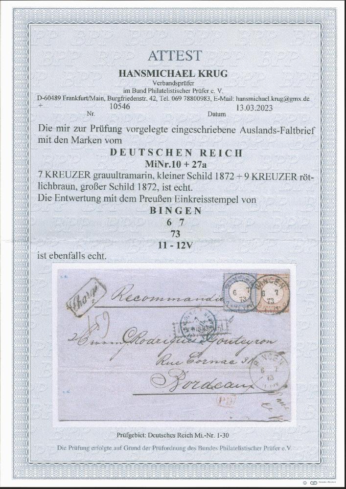 | Zusatzinformationen und Suchstichworte: | 381. Auktion Heinrich Köhler 27. Mai 2023 IBRA Sonderauktion Los 16 7 Kreuzer grauultramarin in Mischfrankatur mit Großer Schild 9 Kreuzer rötlichbraun, beide farbfrisch, gut geprägt und üblich gezähnt, mit sauber aufgesetztem Einkreisstempel "BINGEN 6 7 73" auf Charge-Briefhülle nach Bordeaux. Fotoattest Krug BPP (2023) Ausruf 300,00 EUR Zuschlag 520,00 EUR (aus der Sammlung Erivan Haub) |