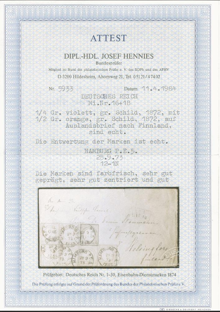 | Zusatzinformationen und Suchstichworte: | 381. Auktion Heinrich Köhler 27. Mai 2023 IBRA Sonderauktion Los 21 ¼ Groschen grauviolett, 2 Einzelwerte in unterschiedlichen Nuancen (eins unten in der Zähnung korrigiert), zusammen mit 5 Exemplaren ½ Groschen orange, ein Wert ein kürzerer Zahn, sonst alle einwandfrei, farbfrisch und gut geprägt, mit Einkreisstempel "HAMBURG P. E. 5 28 9 73" portogerecht auf Briefkuvert über St. Petersburg nach Helsinkfors, Finnland, mit vorderseitigem Anlandestempel. Eine ungewöhnliche und attraktive Frankaturkombination. Fotoatteste Hennies BPP (1984) und Krug BPP (2023) Ausruf 200,00 EUR Zuschlag 700,00 EUR (aus der Sammlung Erivan Haub) |