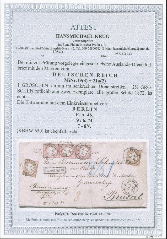 | Zusatzinformationen und Suchstichworte: | 381. Auktion Heinrich Köhler 27. Mai 2023 IBRA Sonderauktion Los 25 2½ Groschen rötlichbraun, 2 Einzelwerte, zusammen mit 1 Groschen karmin im senkrechten 3er-Streifen, alle farbfrisch und gut geprägt, eine 1 Groschen einseitig etwas flache Zähnung, sonst alle gut gezähnt und einwandfrei, mit jeweils sauber auf- und nebengesetztem Einkreisstempel "BERLIN P. A. 46 9/6 74" auf eingeschriebenem Faltbrief der 3.Gewichtsstufe des preußischen Kultusministers Adalbert Falk "An Herrn Restaurator Schmidt aus Berlin - Abzugeben auf der kaiserlich deutschen Gesandtschaft zu Brüssel". Ein seltener, portogerecht frankierten Auslandsbrief. Es ist kein weiterer derartiger Reco-Brief nach Belgien registriert. Signiert Kruschel und Fotoattest Krug BPP (2023) Ausruf 1.000,00 EUR Zuschlag 1.000,00 EUR (aus der Sammlung Erivan Haub) |
