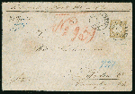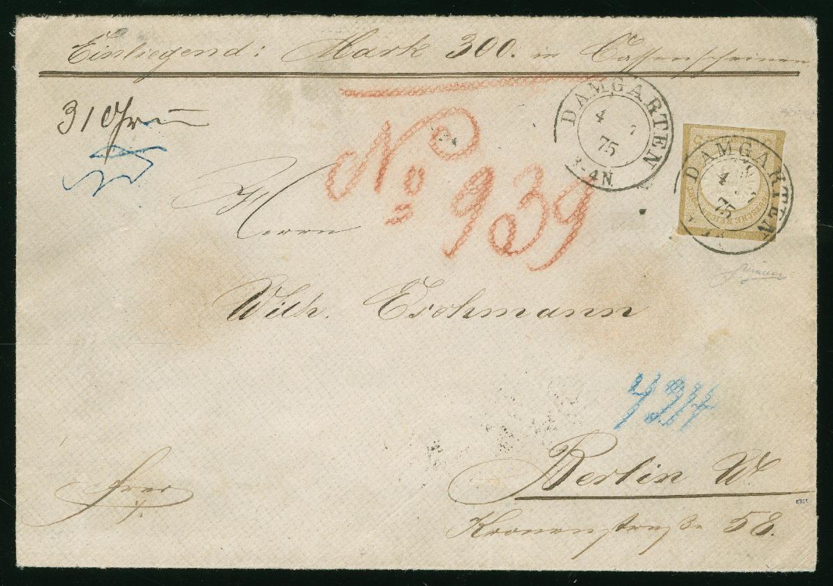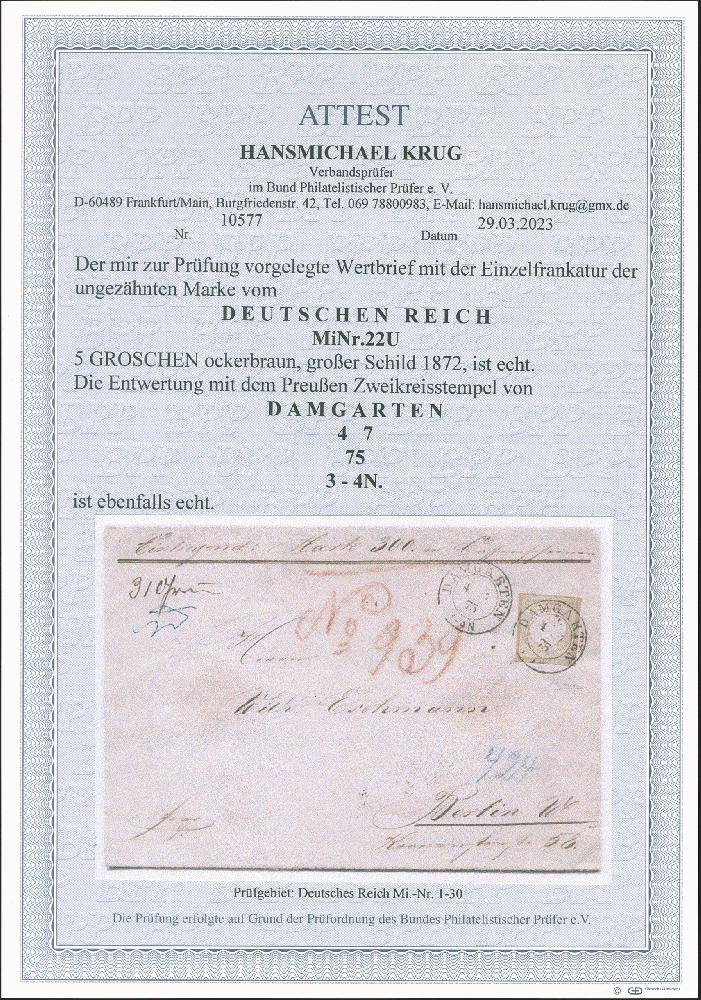 | Zusatzinformationen und Suchstichworte: | 381. Auktion Heinrich Köhler 27. Mai 2023 IBRA Sonderauktion Los 27 Großer Schild 5 Groschen ockerbraun, allseitig breitrandig ungezähnt, farbfrisch und üblich geprägt, mit sauber auf und nebengesetztem preußischem Doppelkreisstempel "DAMGARTEN 4 7 75", als portogerechte 50 Pfennige-Frankatur auf Wertbrief über 300 Mark nach Berlin. Sehr schöne und tadellose Erhaltung. Es sind insgesamt nur 3 Briefe mit ungezähnten Brustschildmarken bekannt, davon dieser als einziger mit der 5 Groschen-Marke. Ein absolutes Highlight der Brustschild- und Deutschland-Philatelie. Fotoatteste Hennies BPP (1982) und Krug BPP (2023) Ausruf 50.000,00 EUR Zuschlag 175.000,00 EUR (aus der Sammlung Erivan Haub) |