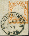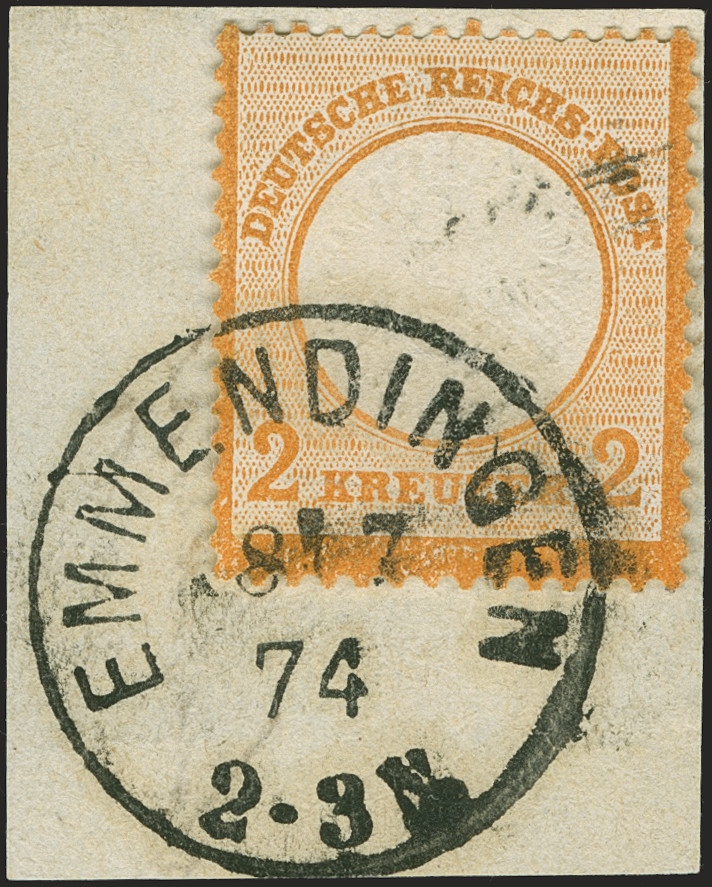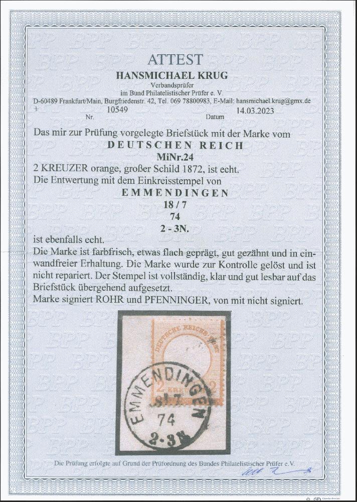 | Zusatzinformationen und Suchstichworte: | 381. Auktion Heinrich Köhler 27. Mai 2023 IBRA Sonderauktion Los 28 2 Kreuzer orange, farbfrisch, etwas flach geprägt, sonst einwandfrei, mit sauber aufgesetztem Einkreisstempel "EMMENDINGEN 18/7 74" auf Briefstück. Die Marke zur Kontrolle gelöst und mit Falz replatziert. Signiert Rohr und Pfenninger, Fotoattest Krug BPP (2023) Ausruf 400,00 EUR Zuschlag 540,00 EUR (aus der Sammlung Erivan Haub) |