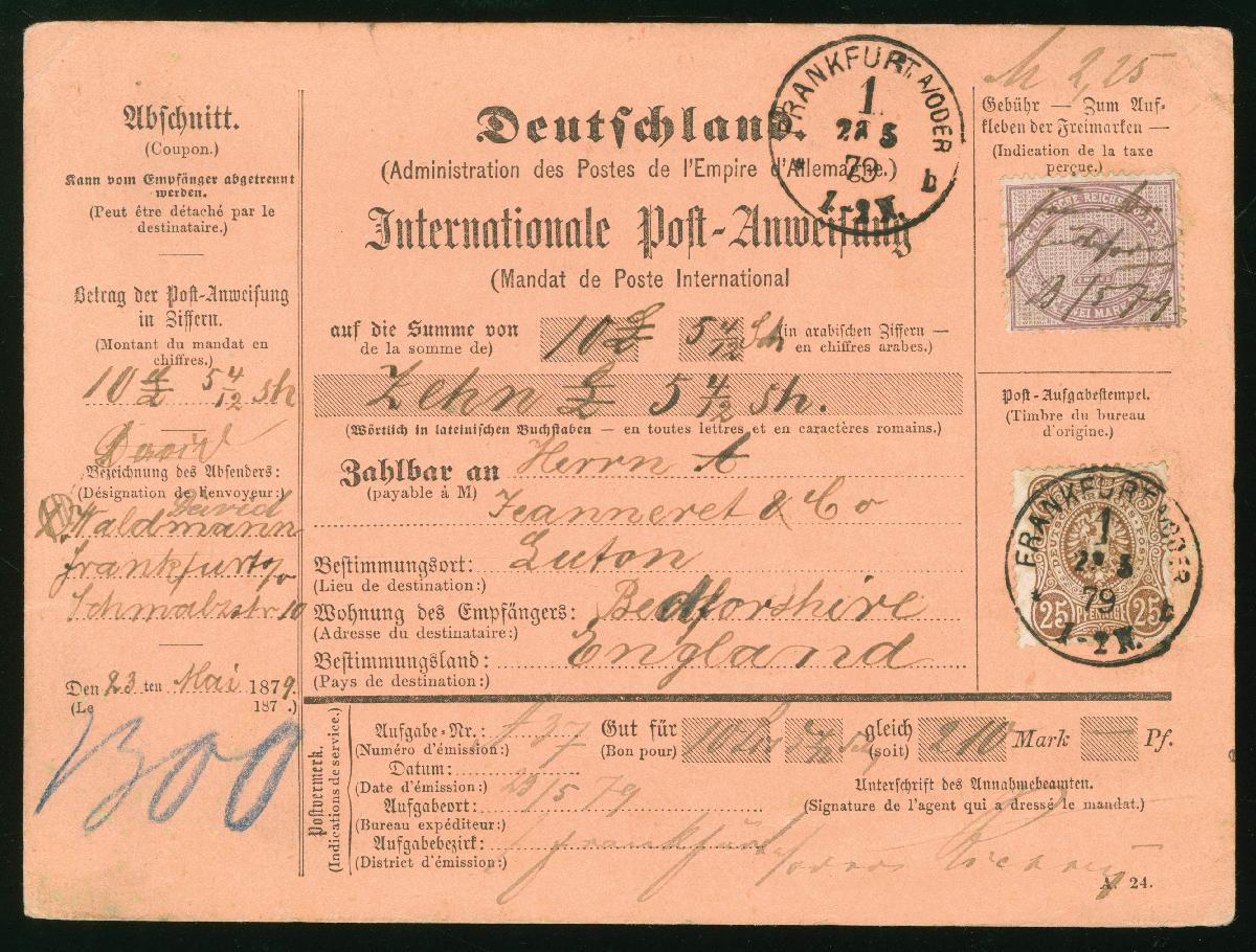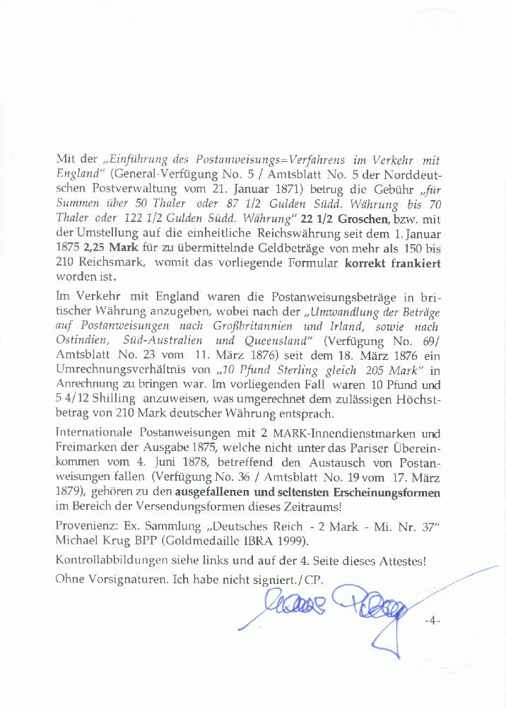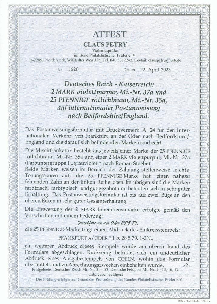 | Zusatzinformationen und Suchstichworte: | 381. Auktion Heinrich Köhler 27. Mai 2023 IBRA Sonderauktion Los 33 wie besehen: 25 Pfennige ein Zähnchen unauffällig geschürft 1875/1900, 2 Mark violettpurpur und 25 Pfennige rötlichbraun, beide farbfrisch und gut gezähnt, mit vorgeschriebener handschriftlicher Entwertung bzw. Einkreisstempel "FRANKFURT A/ODER 23/5 79" auf vollständiger Postanweisung über 10 £ und 5 4/12 Shilling nach England mit rückseitigem Durchgangsstempel von Köln. Die Marken stellenweise minimal gelbfleckig und bei der 25 Pfennige ein Zähnchen unauffällig geschürft, sonst sehr schöne und gute Erhaltung. Ein sehr seltenes frankiertes Formular. Fotoattest Petry BPP (2023) Ausruf 500,00 EUR Zuschlag 2.100,00 EUR (aus der Sammlung Erivan Haub) |