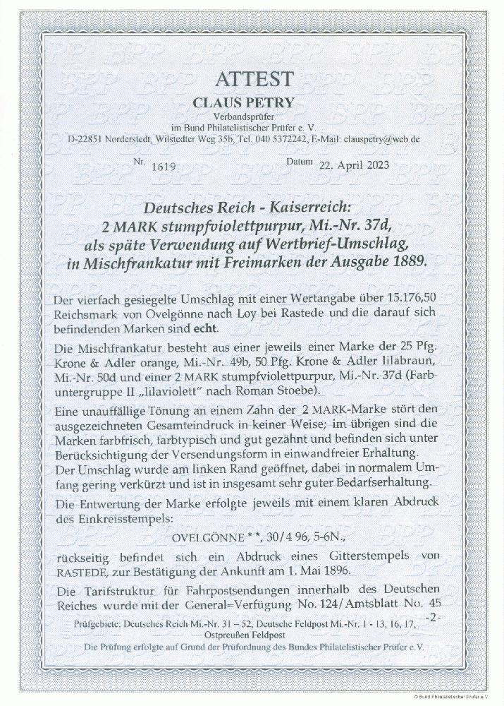 | Zusatzinformationen und Suchstichworte: | 381. Auktion Heinrich Köhler 27. Mai 2023 IBRA Sonderauktion Los 34 2 Mark stumpfviolettpurpur, mit Zufrankatur Krone/Adler 25 Pfennig orange und 50 Pfennig lilabraun, alle farbfrisch und gut gezähnt, mit Stempel "OVELGÖNNE 30/4 96" auf Wertbrief nach Rastede. Das Kuvert am linken Rand durch Öffnung gering verkürzt, sonst sehr gute Erhaltung. Eine äußerst ungewöhnliche und auf Ganzstück möglicherweise einmalig späte Verwendung der 2 Mark stumpfviolettpurpur. Fotoattest Petry BPP (2023) Ausruf 200,00 EUR Zuschlag 420,00 EUR (aus der Sammlung Erivan Haub) |