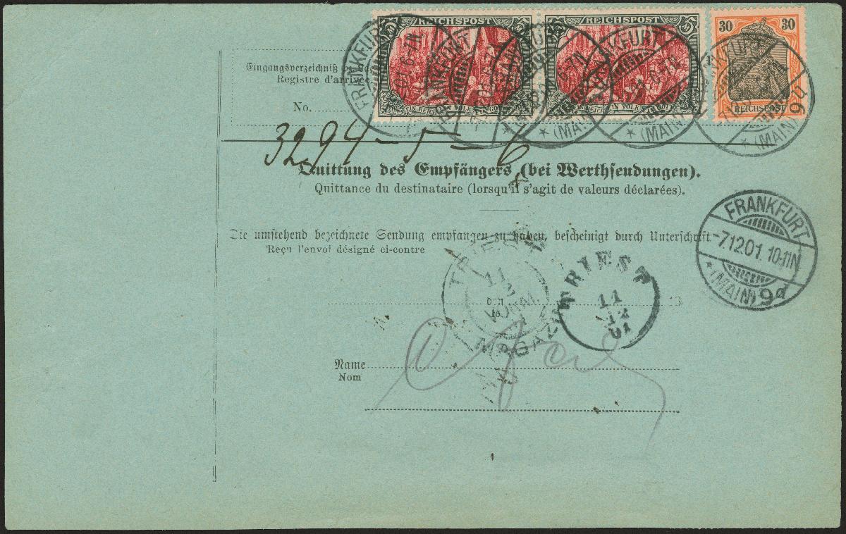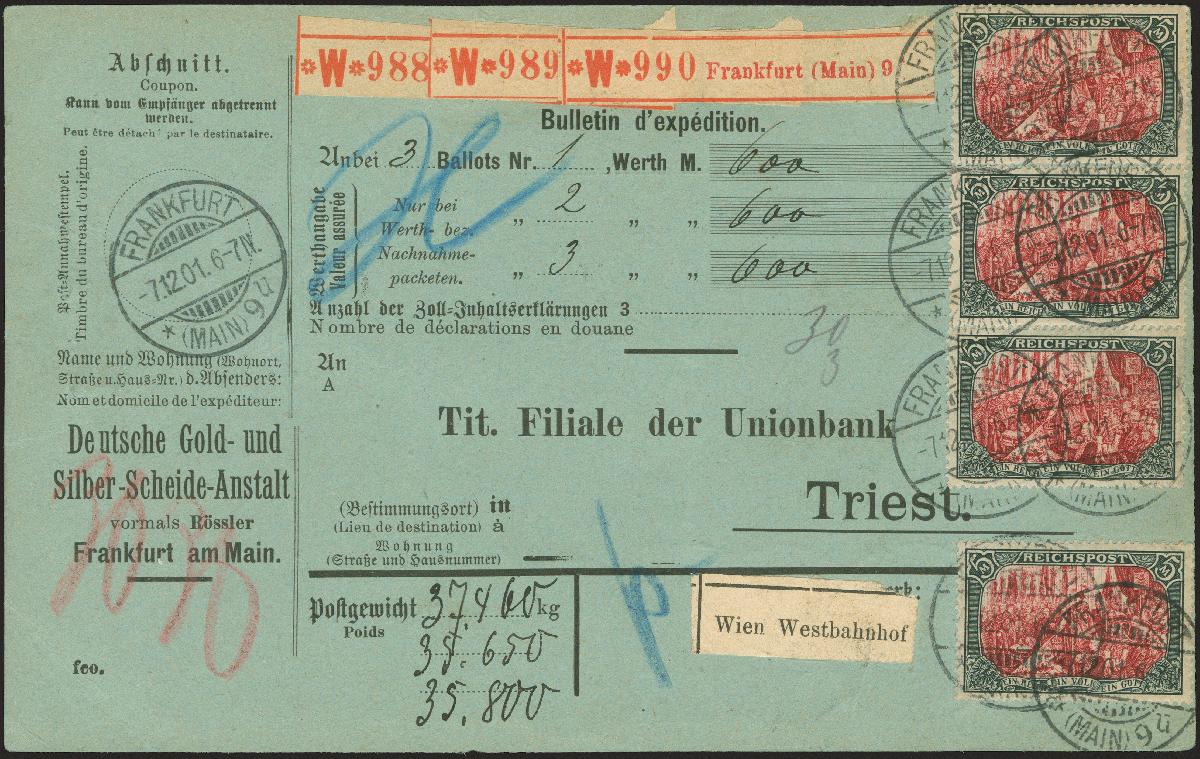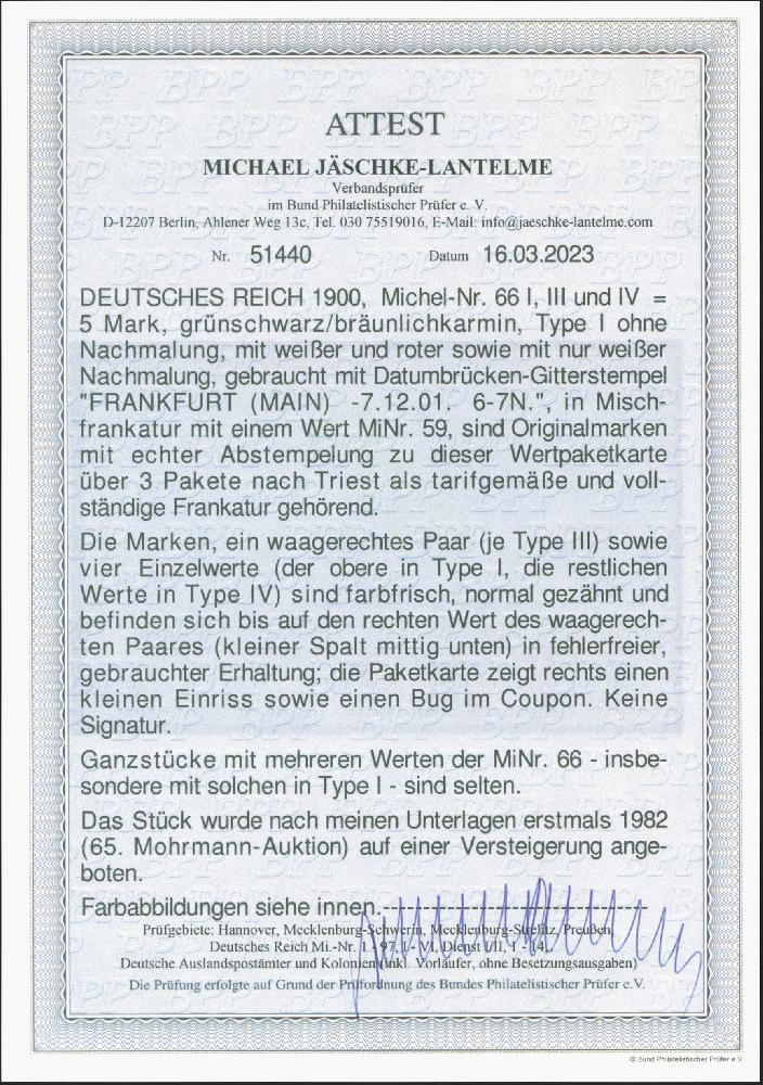 | Zusatzinformationen und Suchstichworte: | 381. Auktion Heinrich Köhler 27. Mai 2023 IBRA Sonderauktion Los 38 1900, Reichspost 5 Mark, waagerechtes Paar und 4 Einzelwerte, dabei eine in Type I und 3 in Type IV, die übrigen in Type III, sowie 30 Pfennig, mit jeweils sauber aufgesetzten Stempeln "FRANKFURT (MAIN) 7.12.01" Vorder-und rückseitig auf Wert-Paketkarte für 3 Pakete der deutschen Gold-und Silber-Scheide-Anstalt nach Triest. Ein Wert in Type III kleiner Spalt, sonst befindet sich die Frankatur in einwandfreier Erhaltung, die Paketkarte mit üblichen kleinen Gebrauchsspuren. Ein außerordentlich seltenes Bedarfsstück. Fotoattest Jäschke-L. BPP (2023) Ausruf 2.000,00 EUR Zuschlag 3.800,00 EUR (aus der Sammlung Erivan Haub) |