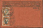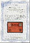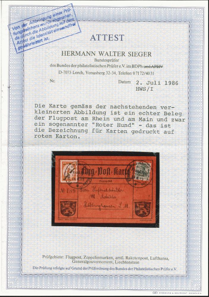 | Zusatzinformationen und Suchstichworte: | 381. Auktion Heinrich Köhler 27. Mai 2023 IBRA Sonderauktion Los 41 1912, Flugpostmarke 'Roter Hund' 1M. auf 10 Pfennig mit doppeltem Aufdruck, erst in gelb, dann in blau, Einzelstück und senkrechtes Paar, dabei die untere Marke des Paares mit dem Aufdruckfehler 'Huna' statt 'Hund', mit jeweils sauber aufgesetztem Sonderstempel " Flugpost am Rhein u. am Main/ Frankfurt (MAIN) 14.6.12" auf roter Sonderkarte nach Hildburghausen. Die einzelne Marke ausgerissener Zahn sowie leichte Zahnfehler links, sonst einschließlich der rückseitigen Frankatur tadellos. Es sind nur wenige derartige Flugpostkarten mit dem doppelten Aufdruck bekannt; mit dem Plattenfehler "Huna" einzig registriertes Stück und somit eine der großen Seltenheiten der Pionierflugpost. Fotoatteste Sieger BPP (1986) und Jäschke-L. BPP (2023) Ausruf 5.000,00 EUR Zuschlag 12.500,00 EUR (aus der Sammlung Erivan Haub) |