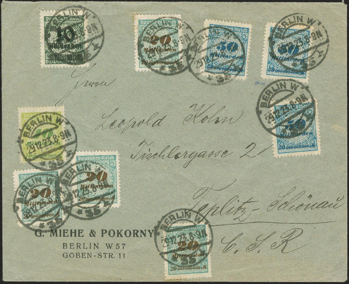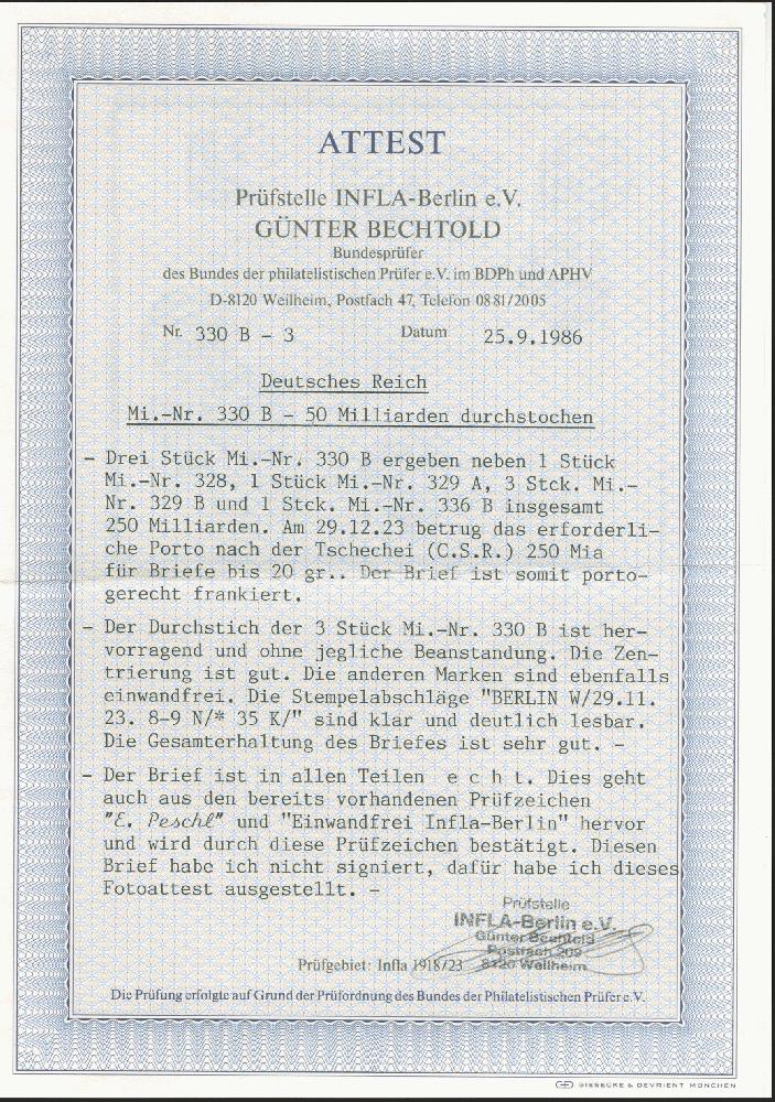 | Zusatzinformationen und Suchstichworte: | 381. Auktion Heinrich Köhler 27. Mai 2023 IBRA Sonderauktion Los 46 50 Milliarden Mark durchstochen, 3 Exemplare, davon eines mit 'Sprung im Korbdeckel' (HT), mit Zufrankatur als portogerechte Frankatur auf Geschäftsbrief von "BERLIN W 29.12.23" nach Teplitz, CSR. Sehr schöne und einwandfreie Bedarfserhaltung. Die 50 Millarden durchstochen mit dem Plattenfehler ist auf Brief außerordentlich selten. Signiert Peschl und Infla, Fotoattest Weinbuch BPP (2022) Ausruf 1.000,00 EUR Zuschlag 1.900,00 EUR (aus der Sammlung Erivan Haub) |