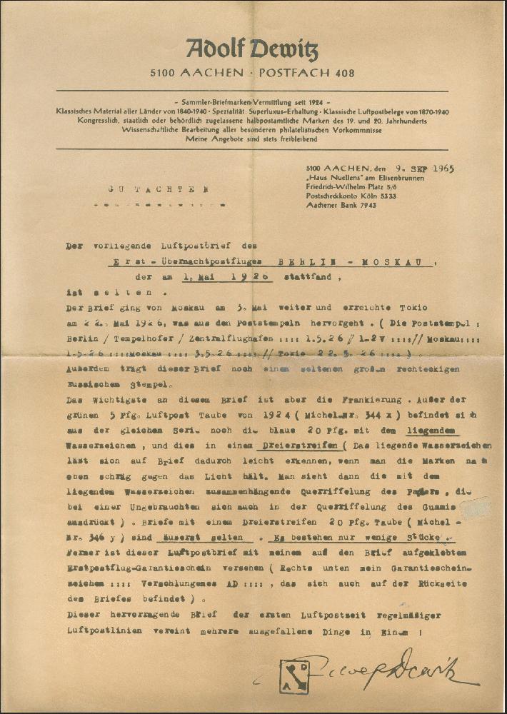 | Zusatzinformationen und Suchstichworte: | 381. Auktion Heinrich Köhler 27. Mai 2023 IBRA Sonderauktion Los 49 1924, Holztaube 20 Pfennig mit liegendem Wasserzeichen, senkrechter 3er-Streifen mit Zufrankatur 5 Pfennig, mit sauber auf- und nebengesetztem Stempel "BERLIN ZENTRALFLUGHAFEN (TEMPELHOFER FELD) 1.5.26" auf Erstflug-R-Drucksache Berlin-Moskau und weiter nach Tokio, mit Transit- und Ankunftsstempeln. Ein Teil der Adresse geschwärzt, sonst einwandfreie Erhaltung. Eine seltene Frankatur. Fotoattest H.-D. Schlegel BPP (1999) Ausruf 200,00 EUR Zuschlag 750,00 EUR (aus der Sammlung Erivan Haub) |