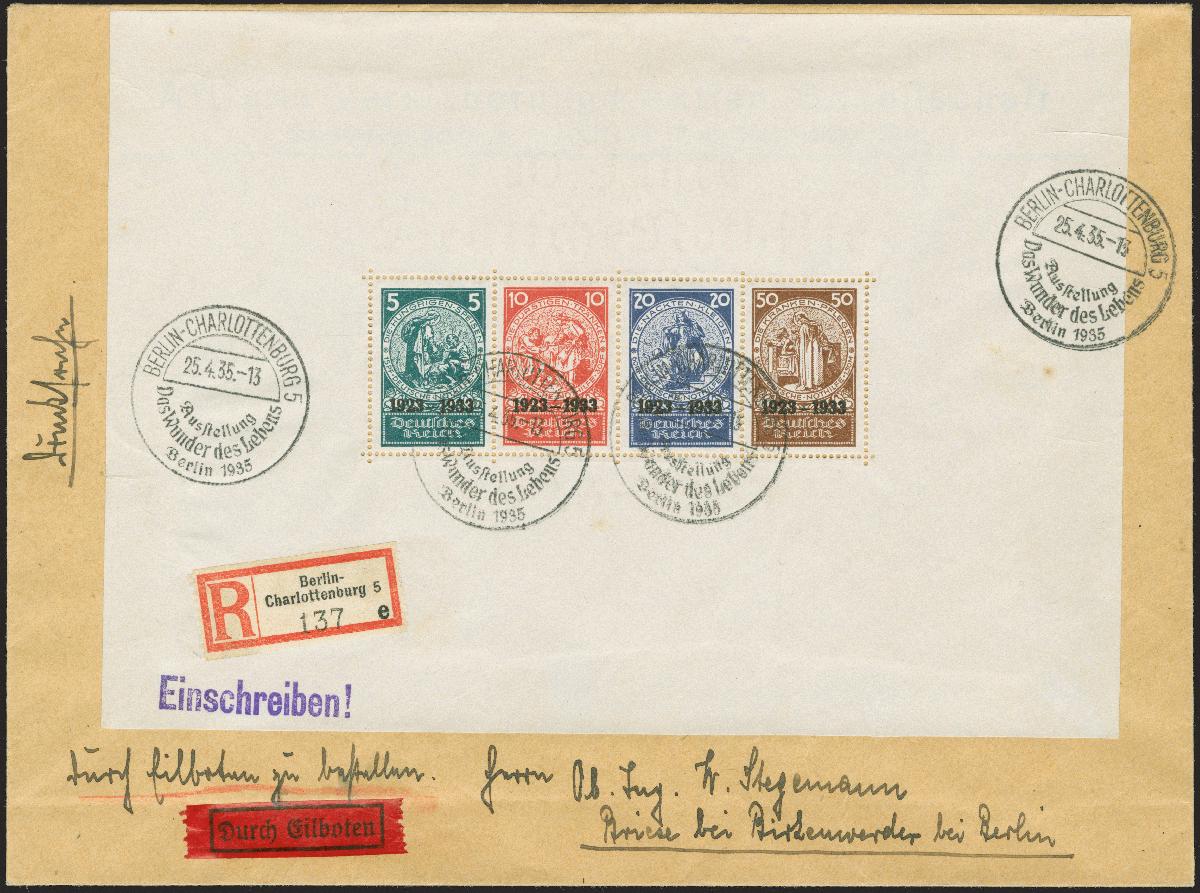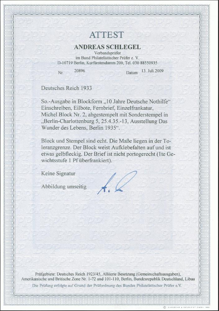 | Zusatzinformationen und Suchstichworte: | 381. Auktion Heinrich Köhler 27. Mai 2023 IBRA Sonderauktion Los 53 1933, Nothilfe-Block im Originalformat, mit mehrfach sauber aufgesetztem Sonderstempel "BERLIN-CHARLOTTENBURG 5 / Ausstellung Das Wunder des Lebens Berlin 1935/ 25.4.1935"auf um 1 Pfennig überfrankiertem Eilboten-R-Brief nach Birkenwerder bei Berlin mit Ankunftsstempel. Der Block im Rand übliche leichte Aufklebefalten und minimal gelbfleckig. Ein attraktiver und seltener Brief. Fotoattest A. Schlegel BPP (2009) Ausruf 2.000,00 EUR Zuschlag 2.000,00 EUR (aus der Sammlung Erivan Haub) |