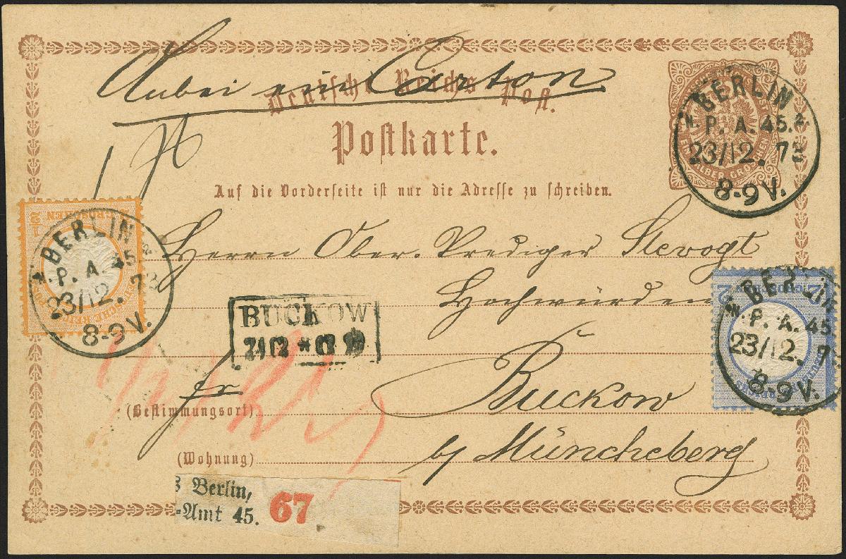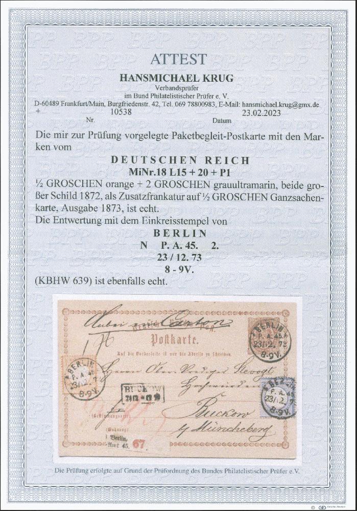 | Zusatzinformationen und Suchstichworte: | 381. Auktion Heinrich Köhler 27. Mai 2023 IBRA Sonderauktion Los 56 1873, Postkarte ½ Groschen braun mit Zufrankatur Großer Schild ½ Groschen orange und 2 Groschen grauultramarin, beide farbfrisch, sehr gut geprägt und gut gezähnt, die ½ Groschen im kleinen Format L 15, mit jeweils sauberem Einkreisstempel "BERLIN P. A. 45 23/12.73" als Paketbegleitkarte nach Buckow mit vorderseitigem Ankunftsstempel. Die Karte links unmerklich verkürzt, sonst sehr schöne und frische Erhaltung. Signiert Kruschel, Fotoattest Krug BPP (2023) Ausruf 200,00 EUR Zuschlag 260,00 EUR (aus der Sammlung Erivan Haub) |