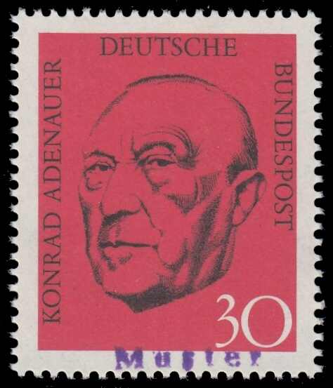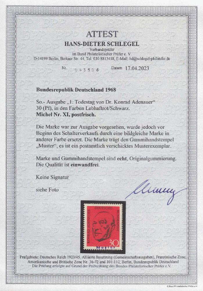 | Zusatzinformationen und Suchstichworte: | Loth 189. Auktion 4. - 6. Mai 2023 Los 2333 Bundesrepublik Deutschland 1968, 30 Pfg. "Roter Adenauer", nicht verausgabter Wert mit Gummihandstempel "Muster" am Unterrand, sehr seltene und kaum angebotene Marke, aktuelles Fotoattest Schlegel "...echt, einwandfrei", Liebhaberstück Ausruf 2.000,00 EUR |