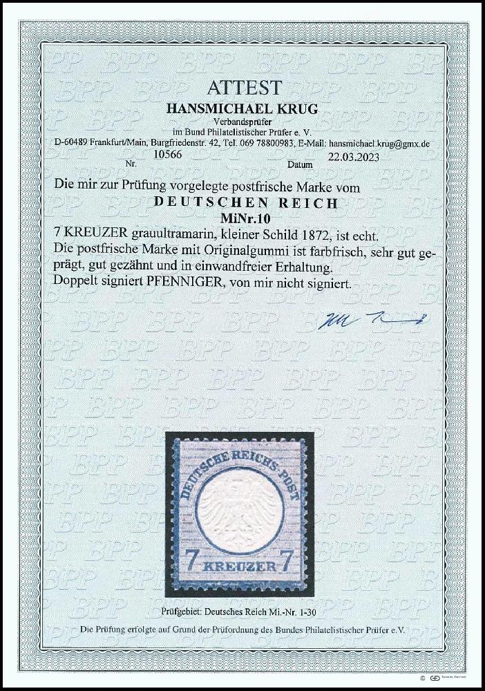 | Zusatzinformationen und Suchstichworte: | Dr. Reinhard Fischer 192. Auktion 19. - 20. Mai 2023 Los 326 Deutsches Reich, 1872 Kleiner Brustschild 7 Kreuzer kleiner Schild, grauultramarin, farbfrisches und sehr gut geprägtes sowie gut gezähntes Kabinettstück in postfrischer Erhaltung, gepr. Pfenninger und Fotoattest Hansmichael Krug BPP (2023): "in einwandfreier Erhaltung."; Mi. 18.000.- - erstmalig können wir Ihnen diese in dieser Qualität sehr seltene Marke in tadelloser, postfrischer Erhaltung anbieten! Eine der wenigen Möglichkeiten diese Rarität zu erstehen! Ausruf 6.500,00 EUR |