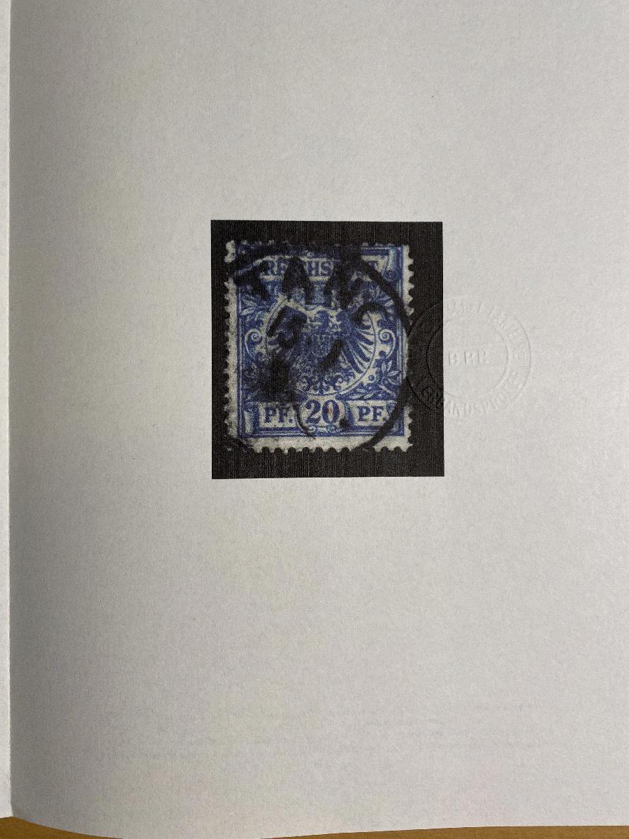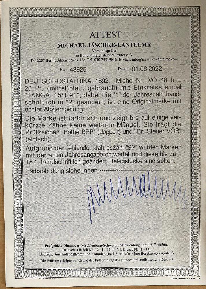 | Zusatzinformationen und Suchstichworte: | Vorläufer 20 Pf, gest. Tanga 15/1/92 wegen fehlender Jahreszahl 92 handschriftlich geänderte 91. |