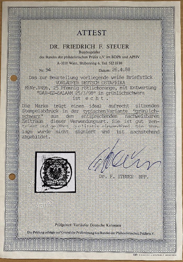 | Zusatzinformationen und Suchstichworte: | Vorläufer 25 Pf, gest. Dar-es-Salaam 25/3/98 |