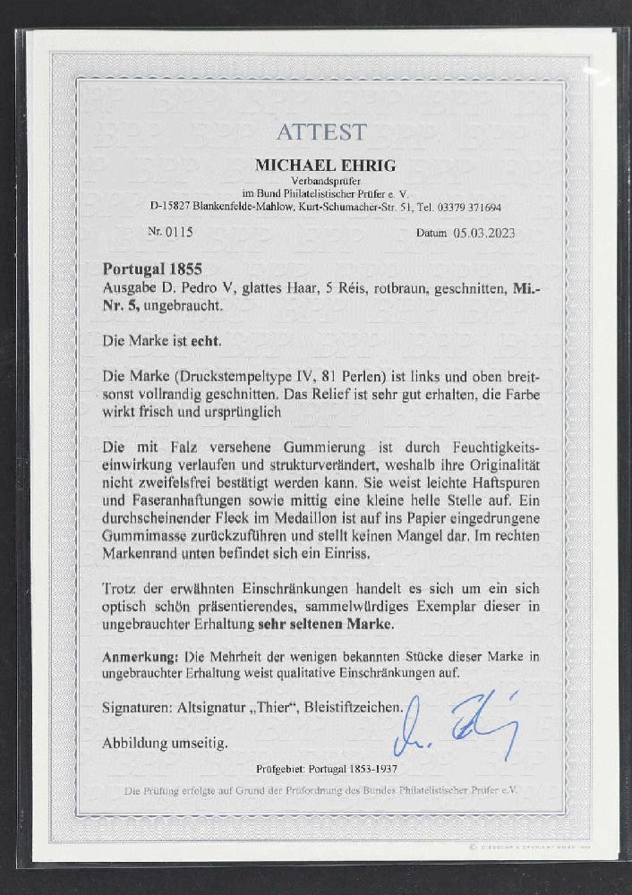 | Zusatzinformationen und Suchstichworte: | 32. Schlegel Auktionshaus Auktion 15. - 19. Mai 2023 Los 4783 Portugal 1855, 5 R. König Pedro V. rotbraun in Druckstempeltype IV (81 Perlen), ungebraucht mit verlaufener und strukturveränderter Gummierung (die Originalität lässt sich dadurch nicht zweifelsfrei bestätigen), links und oben breit-, sonst vollrandiger Schnitt, sehr gute Prägung und frische ursprüngliche Farbe, mittig kleine helle Stelle und Einriss unten, trotz der Unzulänglichkeiten ein sich optisch sehr schön präsentierendes Exemplar dieser ungebraucht sehr seltenen Marke, sign. Thier und Fotoattest Ehrig BPP 03/2023 (ME 12.000,-) Ausruf 1.000,00 EUR |