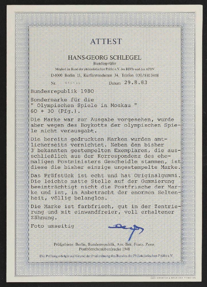 | Zusatzinformationen und Suchstichworte: | 32. Schlegel Auktion 15. - 19. Mai 2023 Los 1 Moskau 1980 - Die boykottierten Olympischen Spiele Die eindrucksvolle Sondermarke der Bundesrepublik war bereits gedruckt. Dann schloss sich das Deutsche Olympische Committee den Boykottstaaten an. 1980 kämpften in Moskau keine Athleten der Bundesrepublik Deutschland um Medaillen. Das beeindruckende Motiv der großen fünf Olympischen Ringe gelangte nie an die Postschalter. Die gesamte Auflage dieser großartigen Sondermarke wurde vernichtet. Ein einziges postfrisches Exemplar blieb in Privathand erhalten. Der Irrtum der Gattin des damaligen Postministers sorgte dafür. Über vier Jahrzehnte - weit mehr als eine Generation - liegen diese Ereignisse zurück. Lassen wir nochmals die historischen Fakten sprechen. Es war ein Irrtum der Gattin des damaligen Postministers, der für die wohl bedeutendste Kostbarkeit der Nachkriegsphilatelie sorgte. Was war geschehen? Der Postminister Kurt Gscheidle erhielt von seinem Ministerium einen Vorlagebogen der unverausgabten "Olympischen Ringe" für die Olympiade 1980 in Moskau. Dieser Vorlagebogen wurde versehentlich im Hause der Familie Gscheidle als Porto verwendet. Vor über 4 Jahrzehnten war es noch üblich dem Empfänger eines Briefes für seine Antwort das Rückporto beizulegen. Dieses als Rückporto vorgesehene Stück aus einem Brief für eine Freundin der Frau Gscheidle blieb postfrisch erhalten. Die "Gscheidle-Irrtümer" sind unter diesem Begriff in die Geschichte eingegangen. UNVERAUSGABTE Marke, die sog. GSCHEIDLE-MARKE. Mit diesem Los kommt die spektakulärste Marke Nachkriegsdeutschlands bei uns zum Angebot. Es ist die postfrische Gscheidle Marke. Vor 40 Jahren wurde sie von Hans-Georg Schlegel attestiert. Seitdem wird im Michel Katalog auf dieses Exemplar mit -.- hingewiesen. Eine kleine Gummiunregelmäßigkeit, die bereits vor 40 Jahren erwähnt wurde ist völlig von sekundärer Bedeutung und sei lediglich der Ordnung halber erwähnt Zuschlag 194.000,00 EUR |
