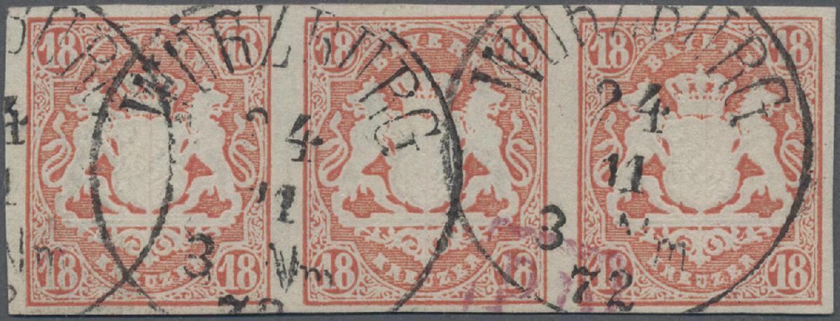 | Zusatzinformationen und Suchstichworte: | Christoph Gärtner 7. Sonderauktion IBRA Essen 26. Mai 2023 Los 16 D Altdeutschland Bayern 1867 'Wappen' 18 Kr. zinnoberrot im waag. DREIERSTREIFEN, sehr sauber entwertet mit Einkreisstempel "WÜRZBURG 24 11 3 Nm. 72" sowie rechtes Paar mit violettem "P.D." im Kästchen, allseits voll- bis breitrandig, farbfrisch, die mittlere Marke gering falzhell, sonst in tadelloser Erhaltung. Eine seltene Einheit. Aktuelles Fotoattest F. Stegmüller BPP. (Mi. 3000,- €) Zuschlag 500,00 EUR |