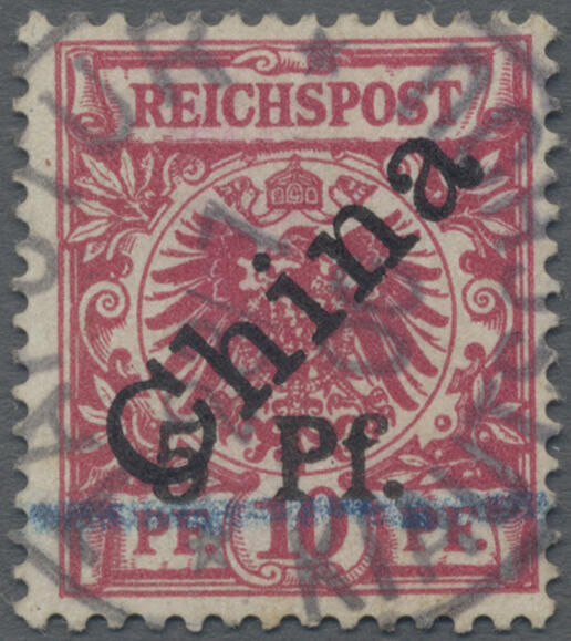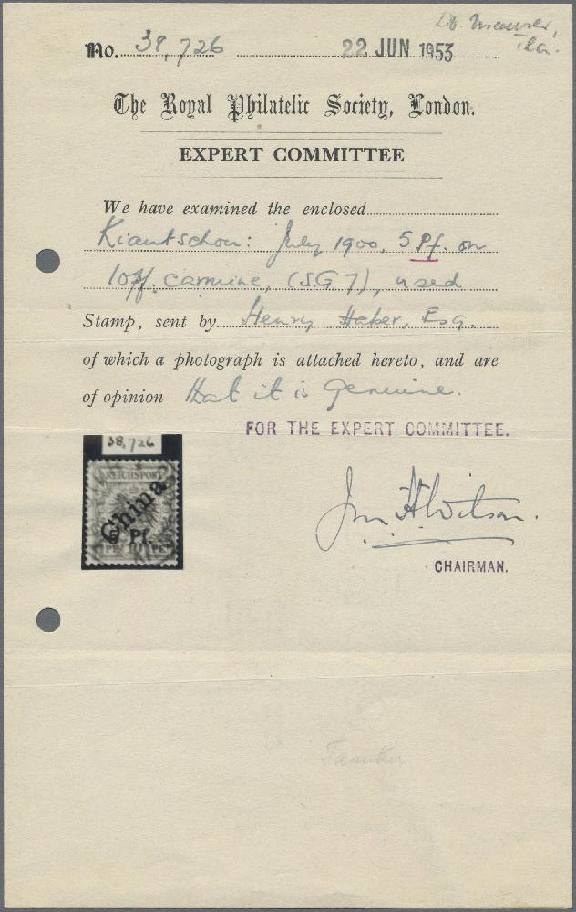 | Zusatzinformationen und Suchstichworte: | Christoph Gärtner 7. Sonderauktion IBRA Essen 26. Mai 2023 Los 27 D Deutsche Kolonien Kiautschou 1900, 2. TSINGTAU-PROVISORIUM, 5 PF auf 10 Pfg., mit Stempel TAPUTUR KIAUTSCHOU 23/7/00, mit Spuren einer alten Reparatur, Foto-Attest Royal Philatelic Society London (1953) bzw. Ronald F. Steuer (2012), eine seltene Marke, Mi 5000,- Zuschlag 750,00 EUR |