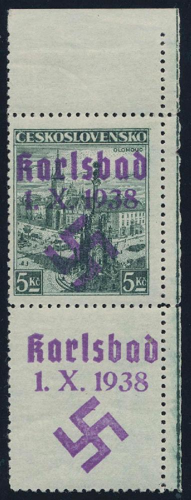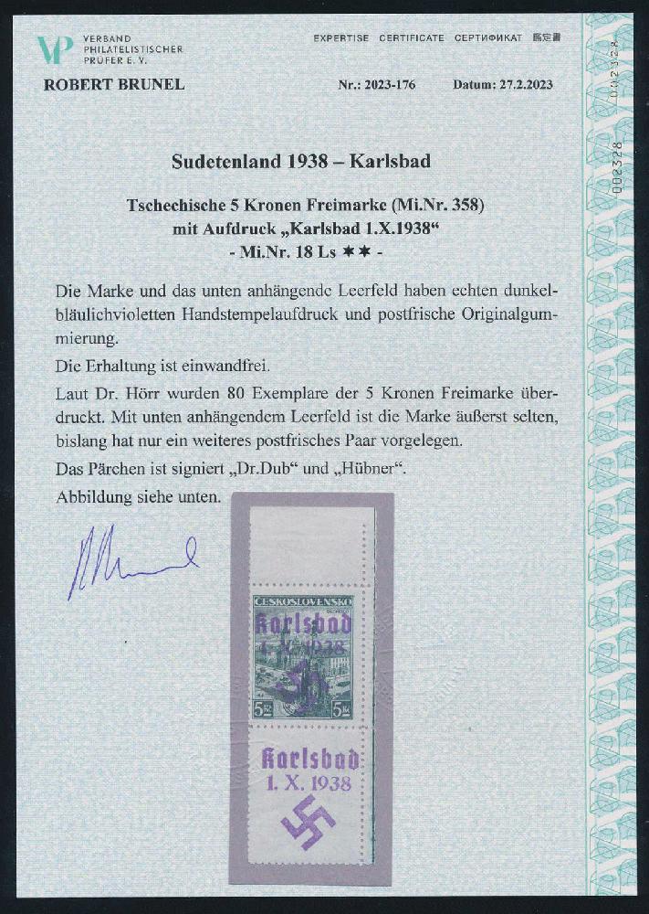 | Zusatzinformationen und Suchstichworte: | HBA 81. Auktion 11. - 13. Mai 2023 Los 1253 (D) Sudetenland Karlsbad 1938, Freimarke Landschaften, 5 Kc., schwarzopalgrün, oben und rechts mit Bogenrand, unten mit anhängendem Leerfeld, Marke und Leerfeld überdruckt, tadellos postfrisches Kabinettstück, auch der Rand und das Leerfeld postfrisch und ungefaltet, äußerst seltenes Stück, es ist nur ein weiteres postfrisches Paar bekannt, Altsign. und gepr. Brunel mit neuem Fotoattest, Mi. ohne Preis, Herr Brunel hat einen Katalogwert von 3500,-- für die Prüfung zugrunde gelegt. Zuschlag 2.000,00 EUR |