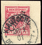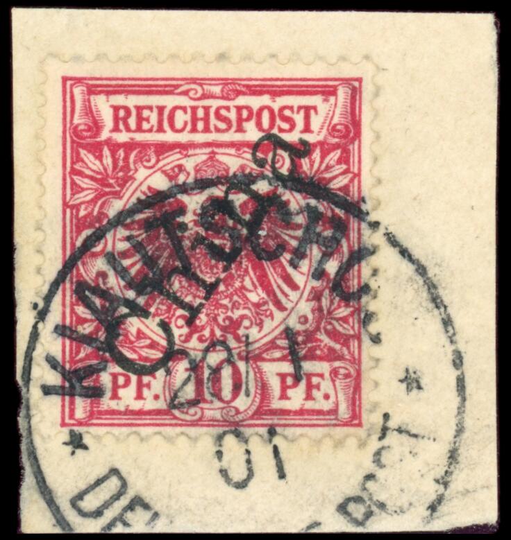 | Zusatzinformationen und Suchstichworte: | Klüttermann - 6. Auktion 27. Juli - 4. August 2023 Los 5957 Deutsche Kolonien Kiautschou, Vorläufer 10 Pfg. lilarot steiler Aufdruck auf Kab-Bfst. mit seltenem Stempel KIAUTSCHOU 28/1 01 mit Aushilfsjahreszahl 01, FA Jäschke-L., Mi./Steuer 4400,- Ausruf 600,00 EUR |