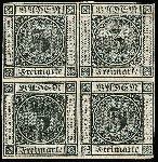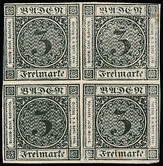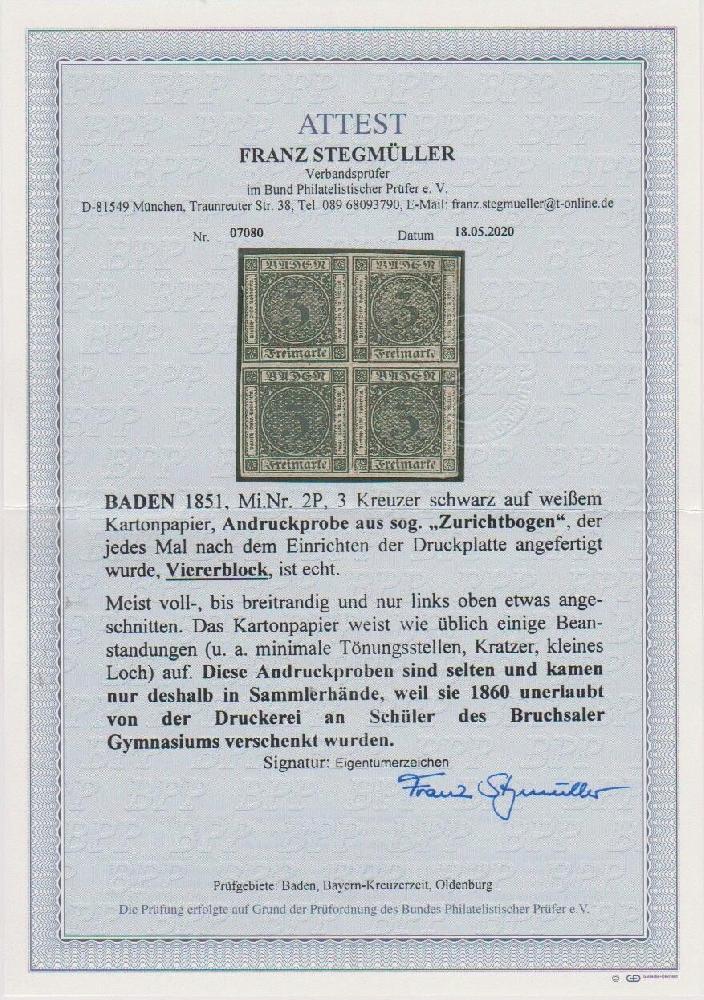 | Zusatzinformationen und Suchstichworte: | Rauhut & Kruschel - 218. Auktion 10. Juni 2023 Los 44 Altdeutschland Baden 3 Kr. schwarz auf weißem Kartonpapier, die Andruckprobe aus dem sog. "Zurichtbogen", der nach Einrichten der Druckplatte angefertigt wurde, im Viererblock (min. Tönung, unteres Paar kl. Kratzer und ein Wert winziges Löchlein), als Einheit von größter Seltenheit, möglicherweise Unikum. Diese Andruckproben verblieben bei der Druckerei zur anschließenden Entsorgung, einige wenige Stücke gelangten jedoch deshalb in den Markt, weil die Druckerei 1860 unerlaubt einige Andruckproben an Schüler des Bruchsaler Gymnasiums verschenkte. Sign. Siegel (Marken- u. Ganzsachenhaus Berlin, 1920er Jahre), sowie Attest Stegmüller Ausruf 1.800,00 EUR |