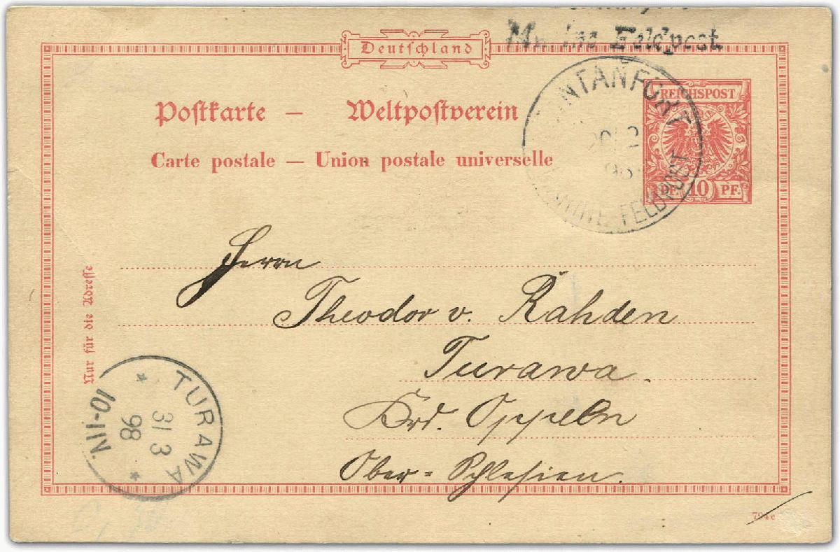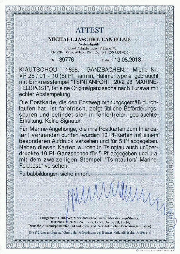 | Zusatzinformationen und Suchstichworte: | 32. Schlegel Auktionshaus Auktion 15. - 19. Mai 2023 Los 6320 Deutsche Kolonien Kiautschou, Vorläufer "TSITANFORT 20.2.98 MARINE-FELDPOST" als einzige Entwertung auf Auslands-Ganzsache zu 10 Pfg. Krone/Adler, über dem Wertstp. schwarzer L 1 "Marine-Feldpost", adressiert nach Turawa, vorderseitig Ankunftsstp. vom 3.3.98, einwandfrei, Fotoattest Jäschke-Lantelme BPP Ausruf 300,00 EUR |
