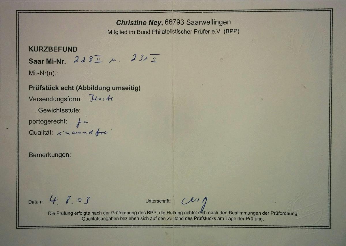 | Prüfgebiet: | Saarland (ab Mi-Nr. 206) |