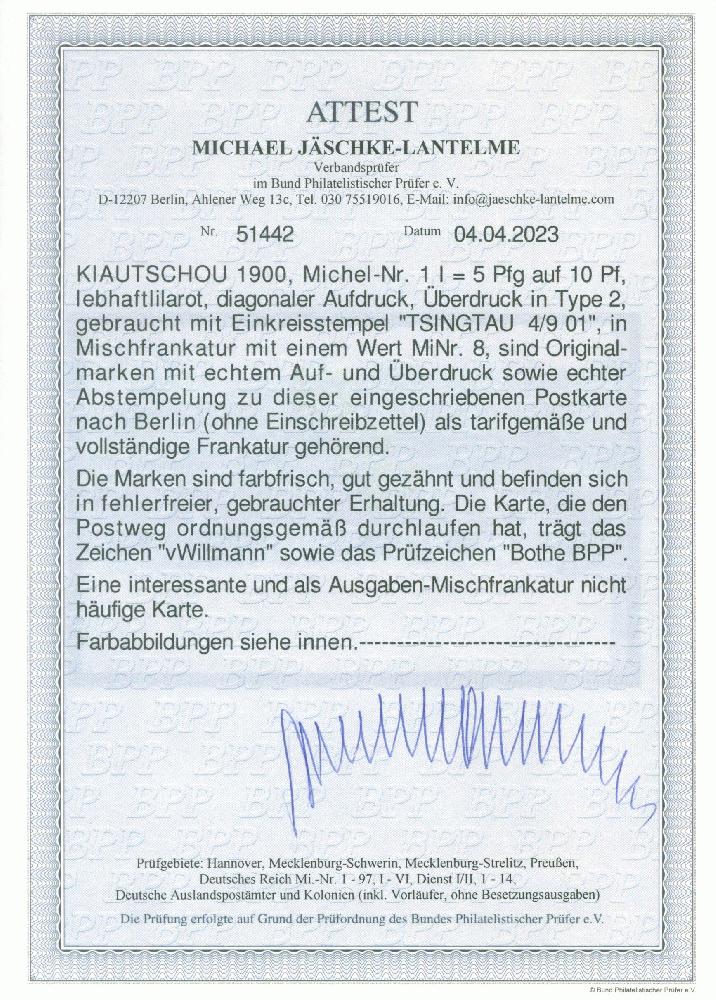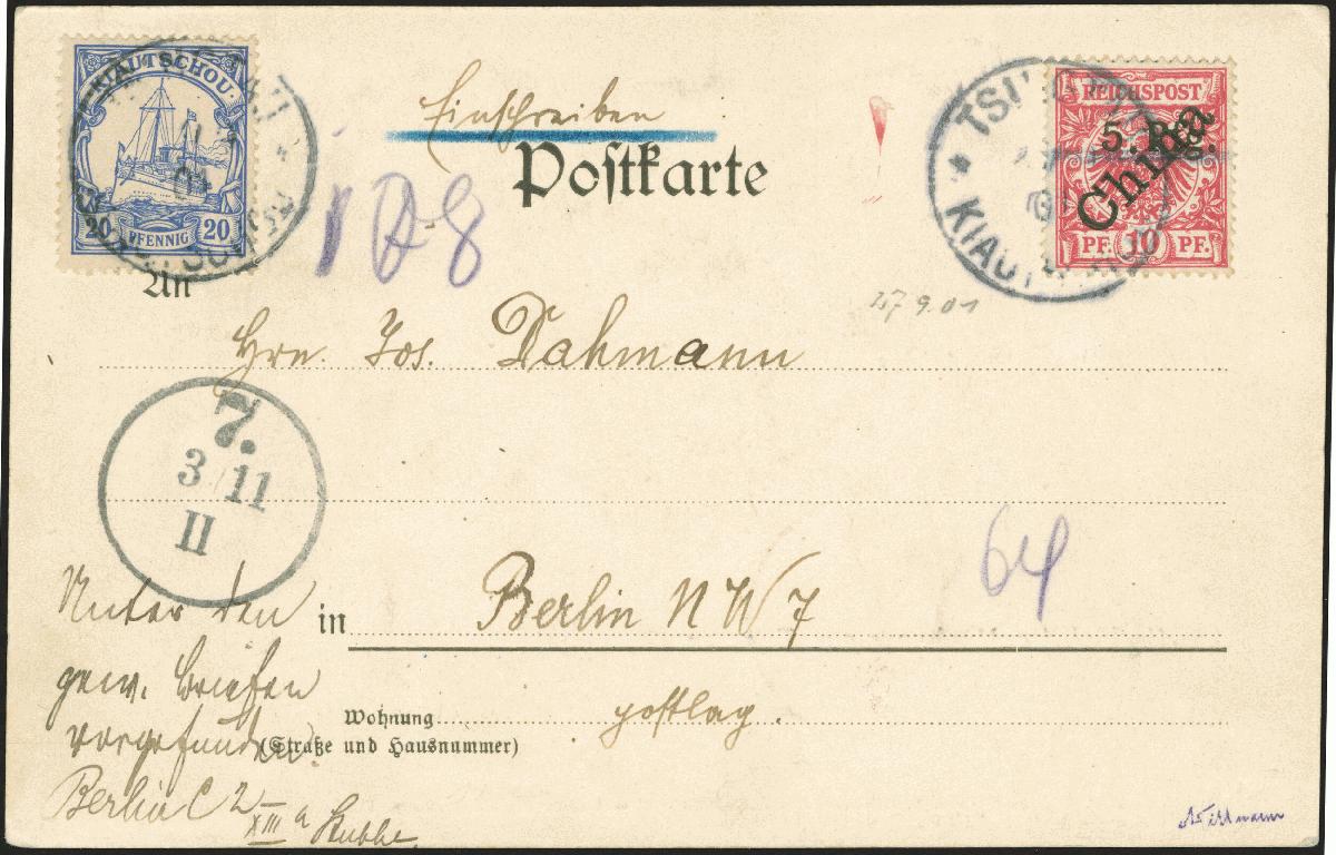 | Zusatzinformationen und Suchstichworte: | Heinrich Köhler - IBRA Sonderauktion - Erivan: Deutschland ab 1872 27. Mai 2023 Los 111 Deutsche Kolonien Kiautschou 5 Pfg. auf 10 Pfennig Diagonalaufdruck, in Mischfrankatur mit Schiffszeichnung 20 Pfennig, beide gestempelt "TSINGTAU 4/9 01" als portogerecht der Frankatur auf eingeschriebener Postkarte nach Berlin, ohne R-Zettel, aber mit handschriftlichem Vermerk "Unter den gew. Briefen vorgefunden/ Berlin C2 XIII a (Unterschrift)". Eine interessante Karte mit seltener Frankatur Kombination. Signiert Bothe BPP, Fotoattest Jäschke-L. BPP (2023) Zuschlag 400,00 EUR |