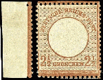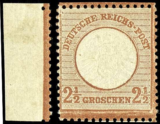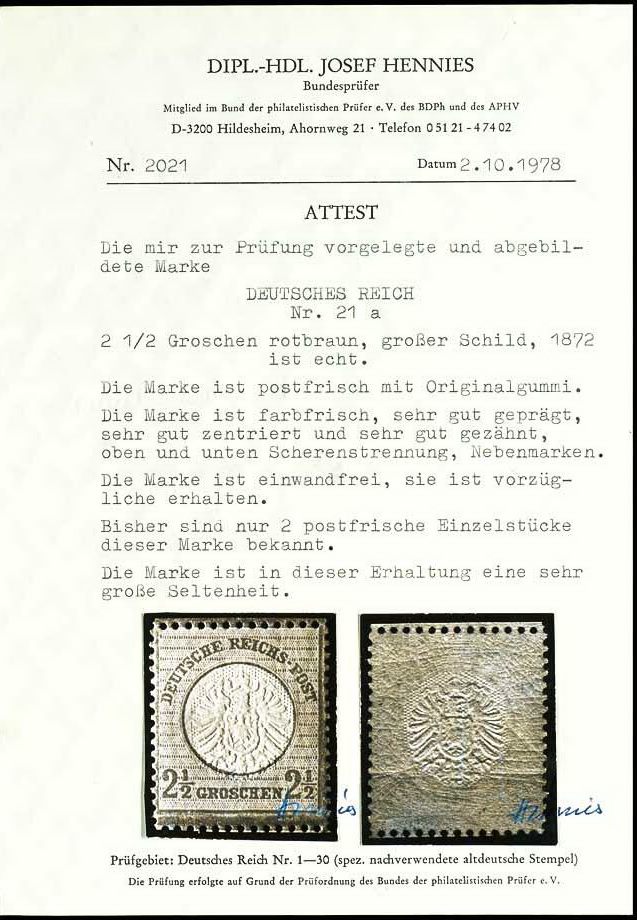 | Zusatzinformationen und Suchstichworte: | Dr. Reinhard Fischer 192. Auktion 19. - 20. Mai 2023 Los 358 Deutsches Reich, 1872 Grosser Brustschild 2 1/2 Groschen großer Schild, rötlichbraun, ungebrauchtes überdurchschnittliches Exemplar mit nur minimalen Haftstellen, unsigniert, Fotoattest Hansmichael Krug BPP (2023): "in einwandfreier Erhaltung. Ungebraucht eine sehr seltene Marke.", beiliegend altes auf ** lautendes Attest Hennies BPP auf "postfrisch, einwandfrei" lautend (Notiz Krug auf Attest, das die Erhaltung nicht korrekt attestiert ist); Mi. 2.600.- Zuschlag 1.200,00 EUR |