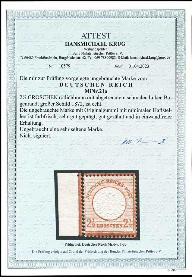 | Zusatzinformationen und Suchstichworte: | Dr. Reinhard Fischer 192. Auktion 19. - 20. Mai 2023 Los 358 Deutsches Reich, 1872 Grosser Brustschild 2 1/2 Groschen großer Schild, rötlichbraun, ungebrauchtes überdurchschnittliches Exemplar mit nur minimalen Haftstellen, unsigniert, Fotoattest Hansmichael Krug BPP (2023): "in einwandfreier Erhaltung. Ungebraucht eine sehr seltene Marke.", beiliegend altes auf ** lautendes Attest Hennies BPP auf "postfrisch, einwandfrei" lautend (Notiz Krug auf Attest, das die Erhaltung nicht korrekt attestiert ist); Mi. 2.600.- Zuschlag 1.200,00 EUR |