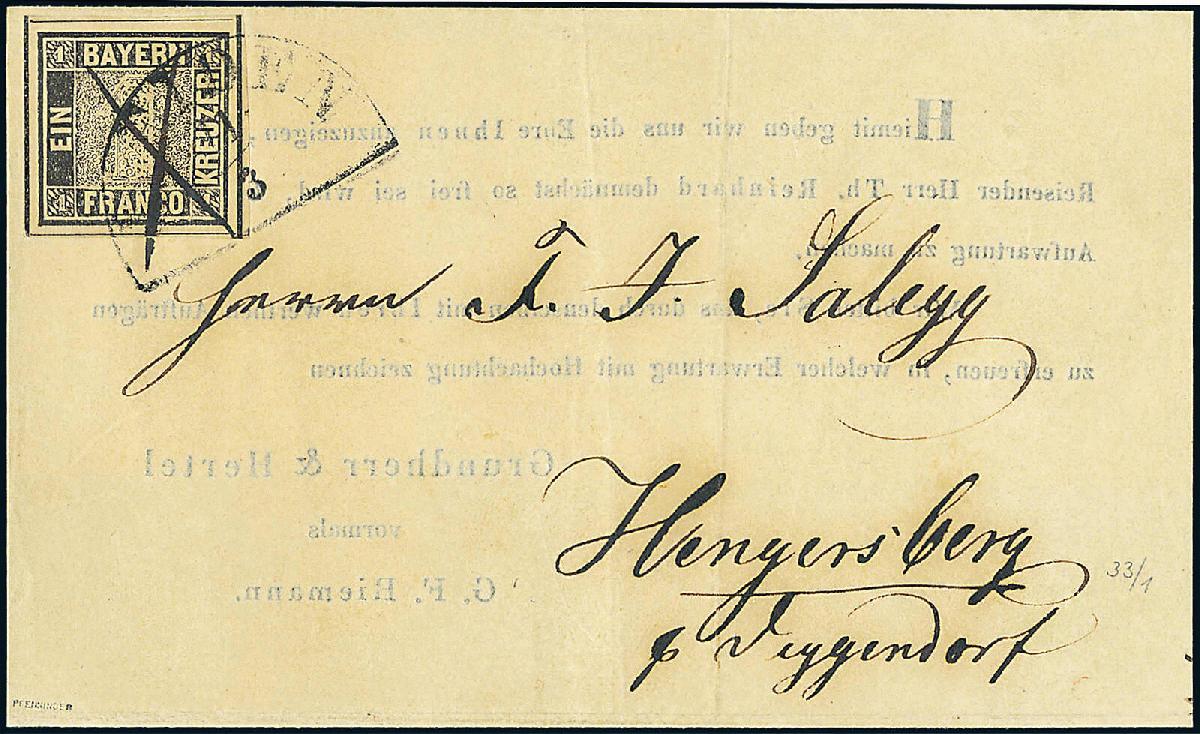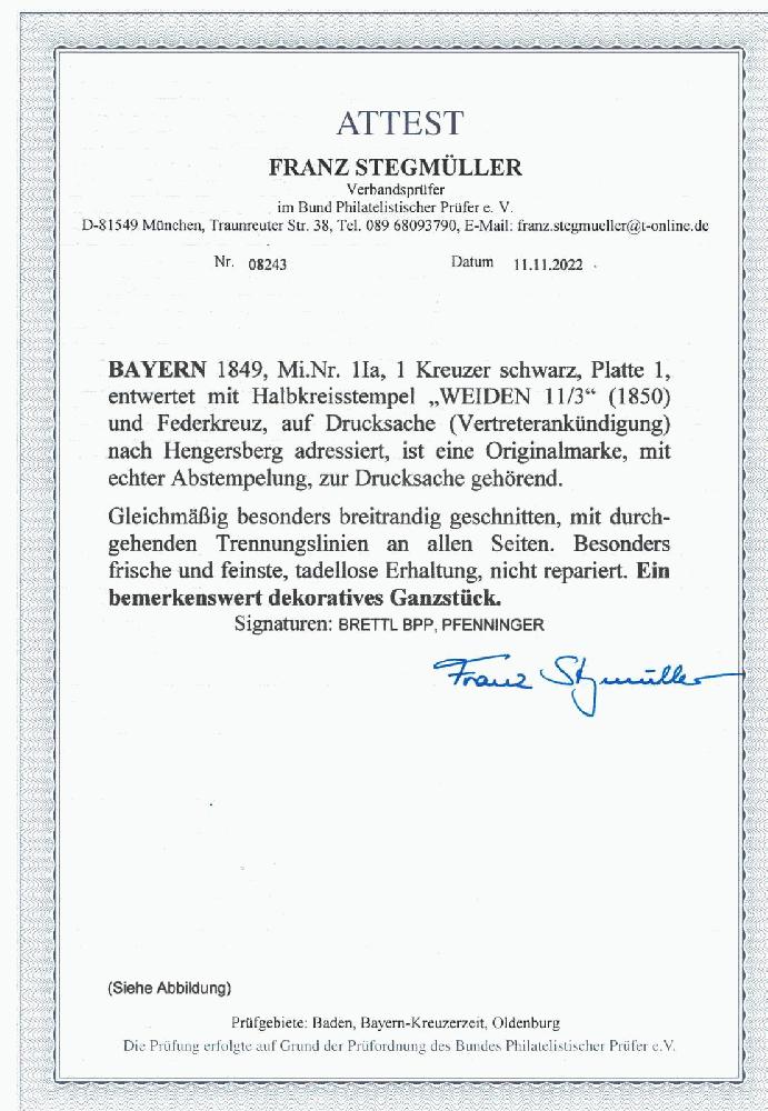 | Zusatzinformationen und Suchstichworte: | 114. Kirstein-Larisch Auktion 1. - 3. Juni 2023 Los 24 Altdeutschland Bayern 1 Kr. schwarz, Platte 1, besonders farbfrisch u. alls. gleichmäßig sehr breitrandig (4 durchgehende SL (3x kpl.)), Luxusstück als EF auf Vertreterankündigung (senkr. Falt.) mit vorschriftsmäßiger Entwertung durch Federkreuz u. HK "WEIDEN 11/3" (1850) nach Hengersberg, FÜR GEHOBENE ANSPRÜCHE, GLANZSTÜCK JEDER SAMMLUNG, gepr. mit Attest Pfenninger: "... PRACHTVOLL WIRKENDES STÜCK IN BESTER ERHALTUNG.", gepr. mit Prüfungsbefund Brettl, neuestes Fotoattest Stegmüller: "EIN BEMERKENSWERT DEKORATIVES GANZSTÜCK." Zuschlag 3.500,00 EUR |