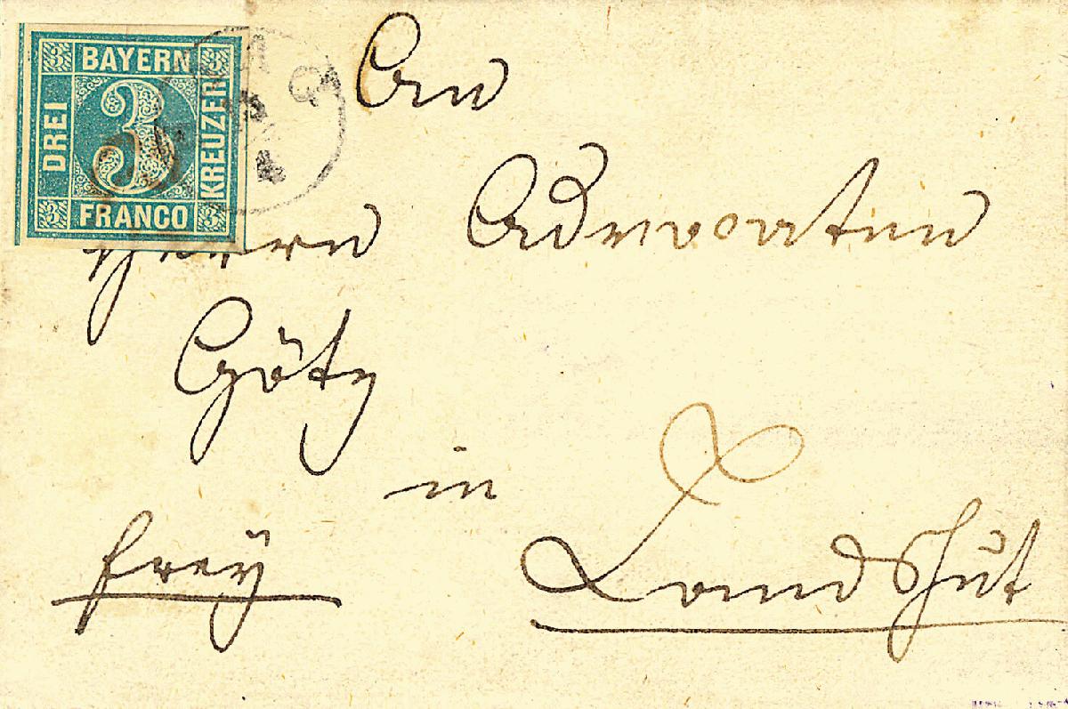 | Zusatzinformationen und Suchstichworte: | 114. Kirstein-Larisch Auktion 1. - 3. Juni 2023 Los 36 Altdeutschland Bayern 3 Kr. blau, Platte 1, farbfrisch (Tinte der Anschrift schlägt nach vorne durch) u. alls. breitrandig (li. kpl. SL), Prachtstück als EF auf Faltbrief mit Fgh.- Stpl. "HAAG 13/4" nach Landshut, selten, sign. Hartmann, gepr. Pfenninger, Fotoattest Stegmüller Ausruf 280,00 EUR |