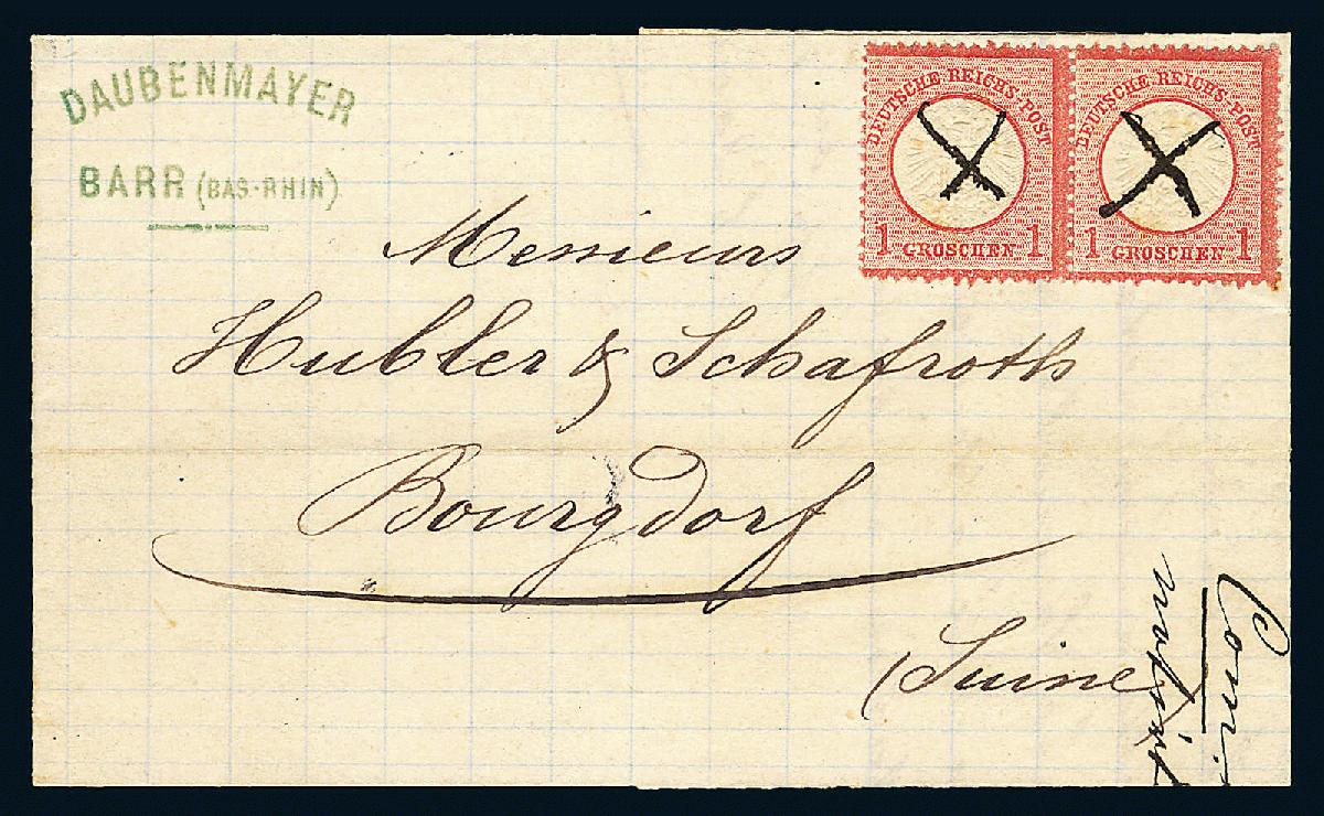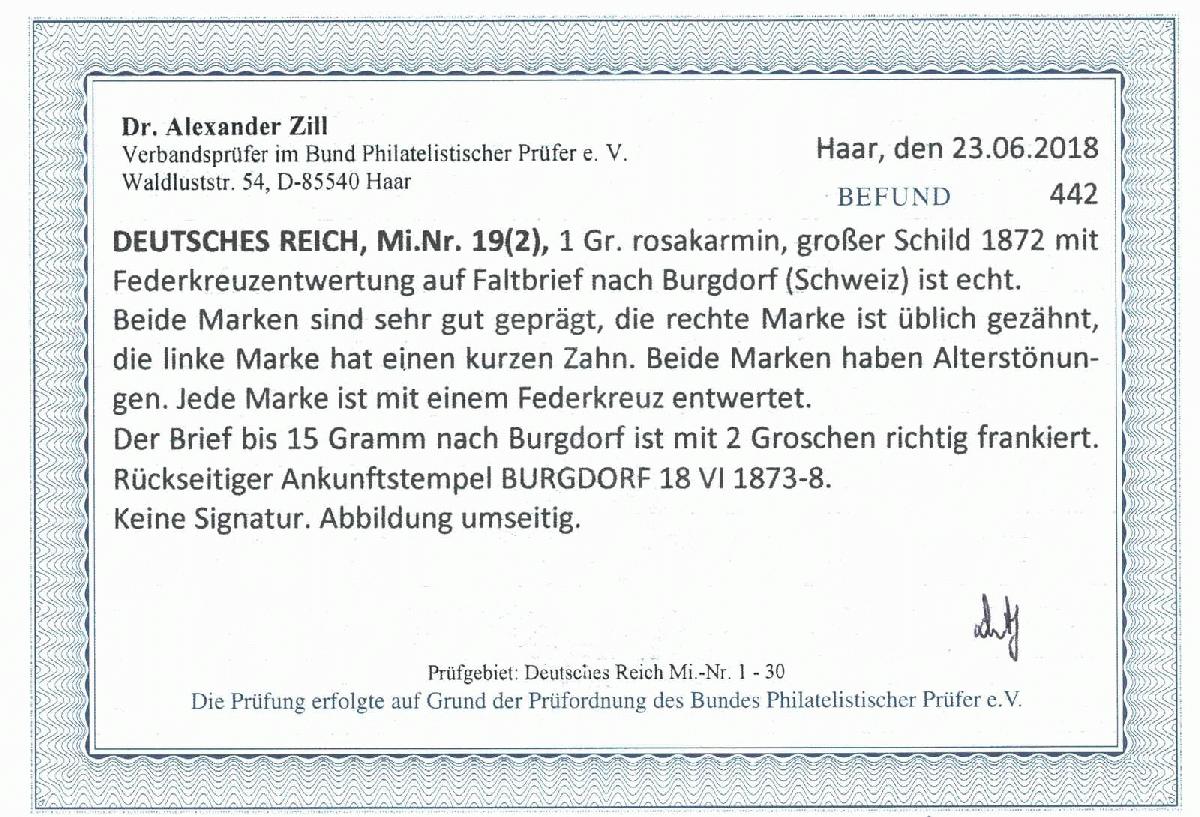 | Zusatzinformationen und Suchstichworte: | 114. Kirstein-Larisch Auktion 1. - 3. Juni 2023 Los 379 Deutsches Reich, 1872 Grosser Brustschild 1 Gr. karmin, kl. Beanst., 2 Prachtwerte als MeF auf Faltbrief mit Federzugentwertung von Barr (Bas-Rhin) nach "BURGDORF 18 VI 73"/ SCHWEIZ, aktueller Fotobefund Zill Ausruf 25,00 EUR |