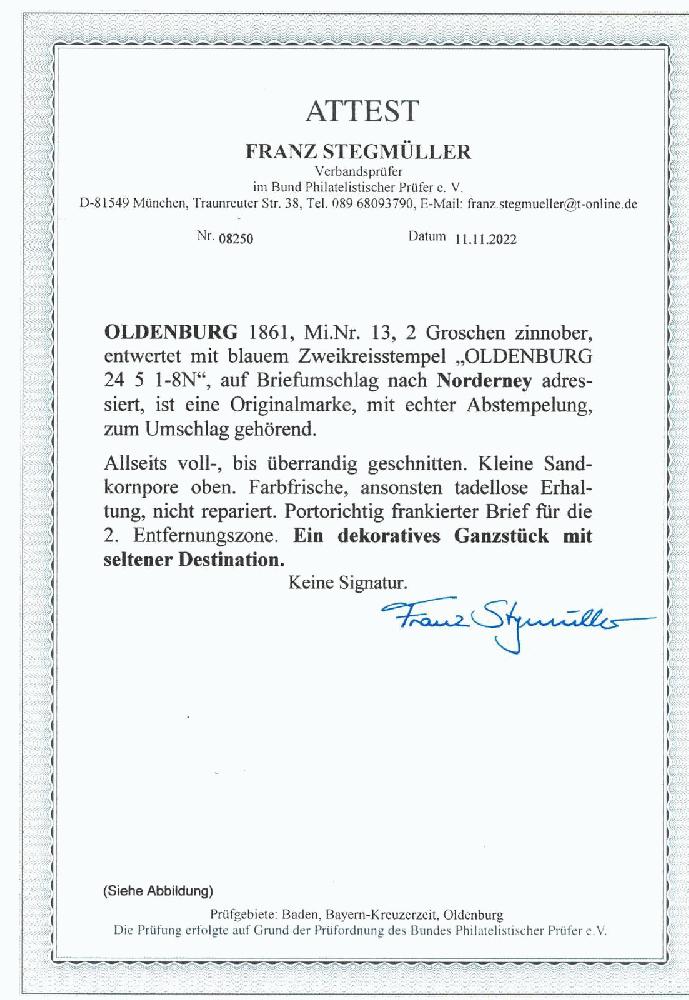 | Zusatzinformationen und Suchstichworte: | 114. Kirstein-Larisch Auktion 1. - 3. Juni 2023 Los 321 Altdeutschland Oldenburg 2 Gr. zinnober, kl. unbedeut. Sandkornpore, farbfrisch u. alls. voll-/ überrandig (rechts mit Teil der Nachbarmarke), Prachtstück auf kleinem Kuvert (kl. Beanst.) mit blauem K2 "OLDENBURG 24 5 1-8N" nach "NORDERNEY. 26 MAY 11-12", Fotoattest Brettl/ Schmitt, neuestes Fotoattest Stegmüller: "EIN DEKORATIVES GANZSTÜCK MIT SELTENER DESTINATION." Zuschlag 460,00 EUR |