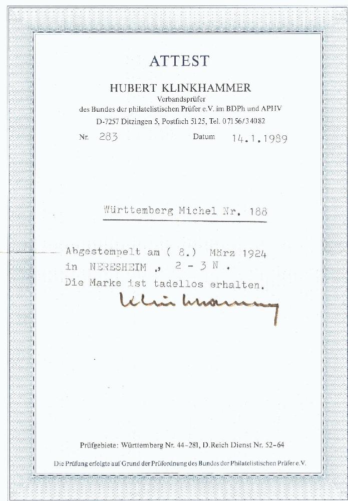 | Zusatzinformationen und Suchstichworte: | 114. Kirstein-Larisch Auktion 1. - 3. Juni 2023 Los 366 Altdeutschland Württemberg 50 Pf. auf 25 Pf. rotorange, farbfrisch u. gut gez., Prachtstück mit K1 "NERESHEIM 8 MRZ 24", selten, gepr. mit Fotoattest Infla/ Klinkhammer Zuschlag 150,00 EUR |