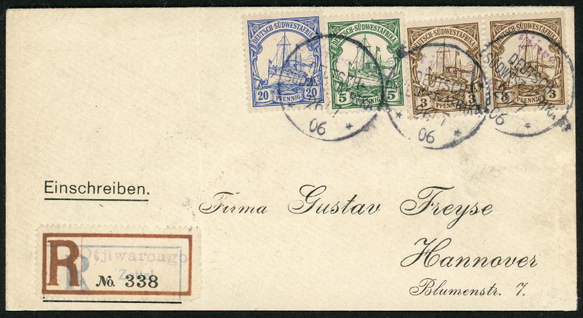 | Zusatzinformationen und Suchstichworte: | Klüttermann - 6. Auktion 27. Juli - 4. August 2023 Los 5724 Deutsche Kolonien Südwestafrika Otjiwarongo 26.7.06, viol. Wdst. Rundschrift auf R-Brief mit Paar 3,5 und 20 Pfg. nach Hannover, Umschlag abseits der Marken Bug, FB Jäschke-L Ausruf 250,00 EUR |