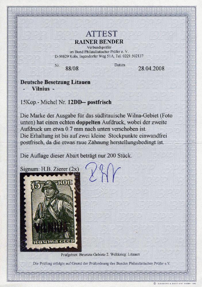 | Zusatzinformationen und Suchstichworte: | 80. Viennafil Live-Auktion 30. Mai - 1. Juni 2023 Los 2442 Deutsche Besetzung II. WK Litauen 1941, Vilnius, 15 K dunkelgraugrün, doppelter Aufdruck, postfrisch, signiert Zierer, Attest Bender, zwei kleine Stockpunkte, Mi. 12 DD / 1000,- Zuschlag 250,00 EUR |