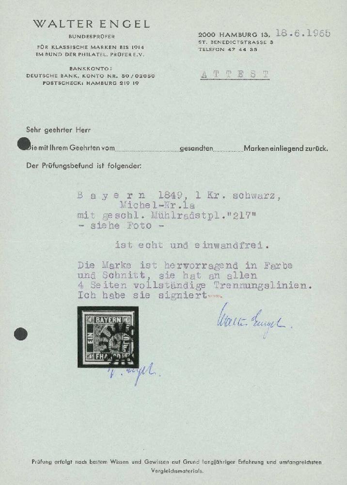 | Zusatzinformationen und Suchstichworte: | Ulrich Felzmann 178. Auktion 22. Juni 2023 Los 2472 Altdeutschland Bayern 1 Kr schwarz in tiefer Farbe, Platte 1, ringsum breitrandig geschnitten mit 4 Zwischenlinien (!) und sauberem Mühlradstempel "217" - MÜNCHEN in fehlerfreier Kabinetterhaltung, mehrfach signiert, Fotoatteste Engel und Schmitt BPP Ausruf 1.000,00 EUR |